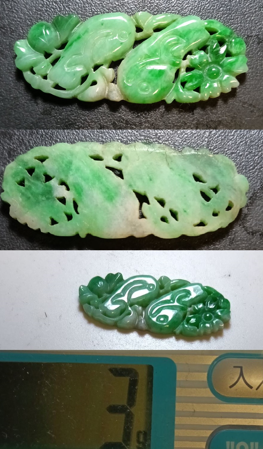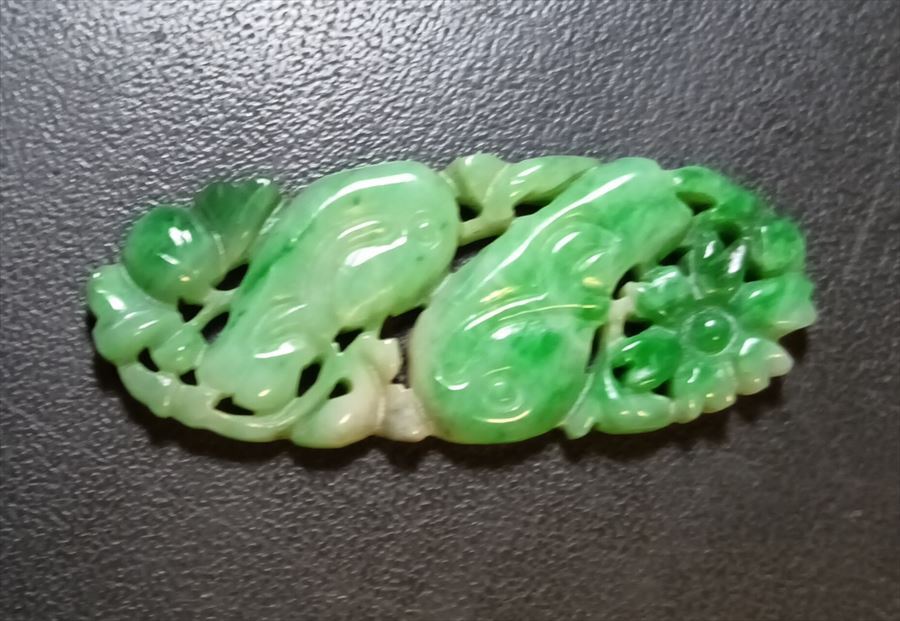 深緑 本翡翠 帯留め 35x14x3mm 重さ3g 中国古美術 古美味 時代物 古董品