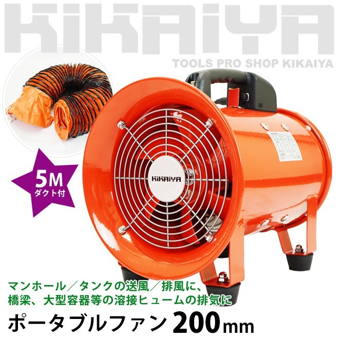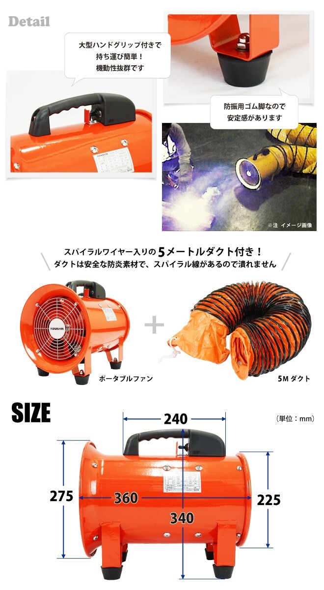 ●マンホール/タンクの送風/排風に、橋梁、大型容器等の溶接ヒュームの排気に大型ハンドグリップ付きで持ち運び簡単な上、機動性抜群 ●機械等の部分冷却にもご使用頂けます ●ダクトを折曲げてもスパイラル線があるので潰れません ●ダクトを外した状態で使用すると音が大きくなります ●専用フレキシブルダクト5メートル1本付き 別売りで延長用ダクト5メートルも販売しております |