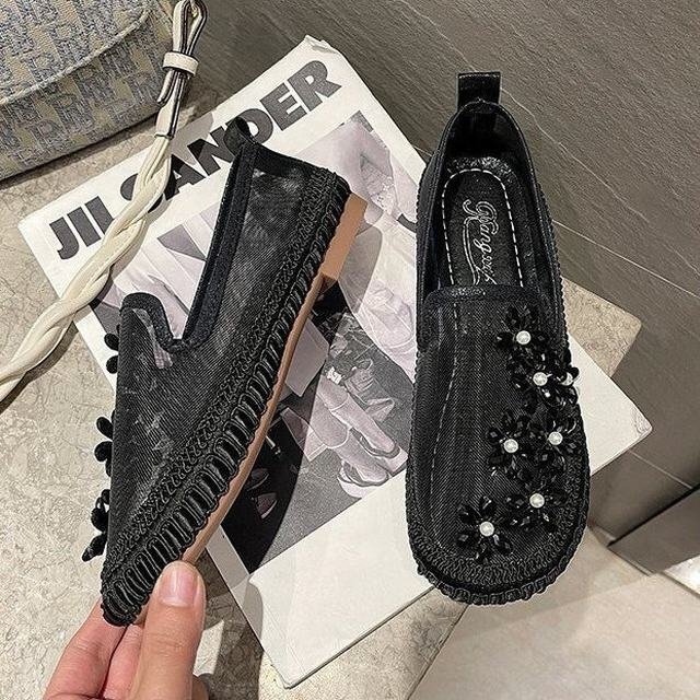 スリッポン ぺたんこ レディース ローファー 花柄 サマーシューズ 通気 夏コーデ 可愛い レースメッシュ 快適 ブラック 23.5cm
