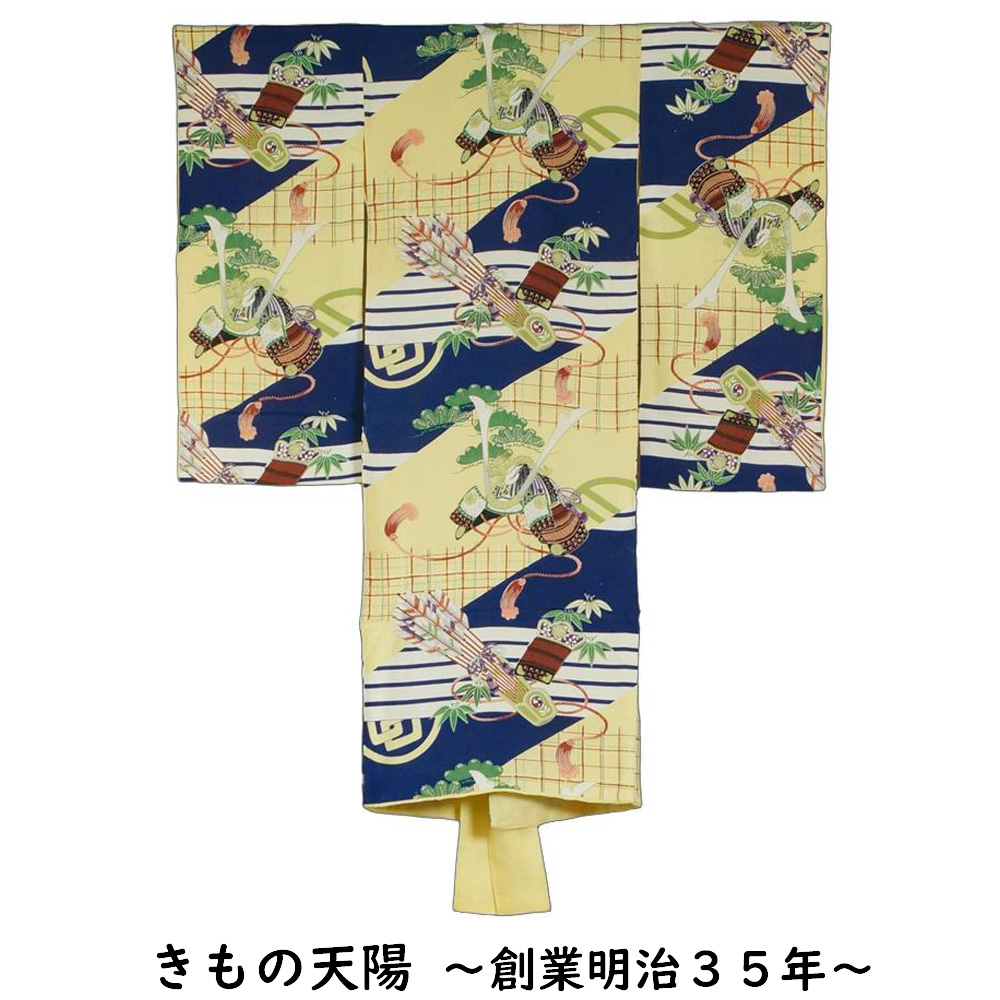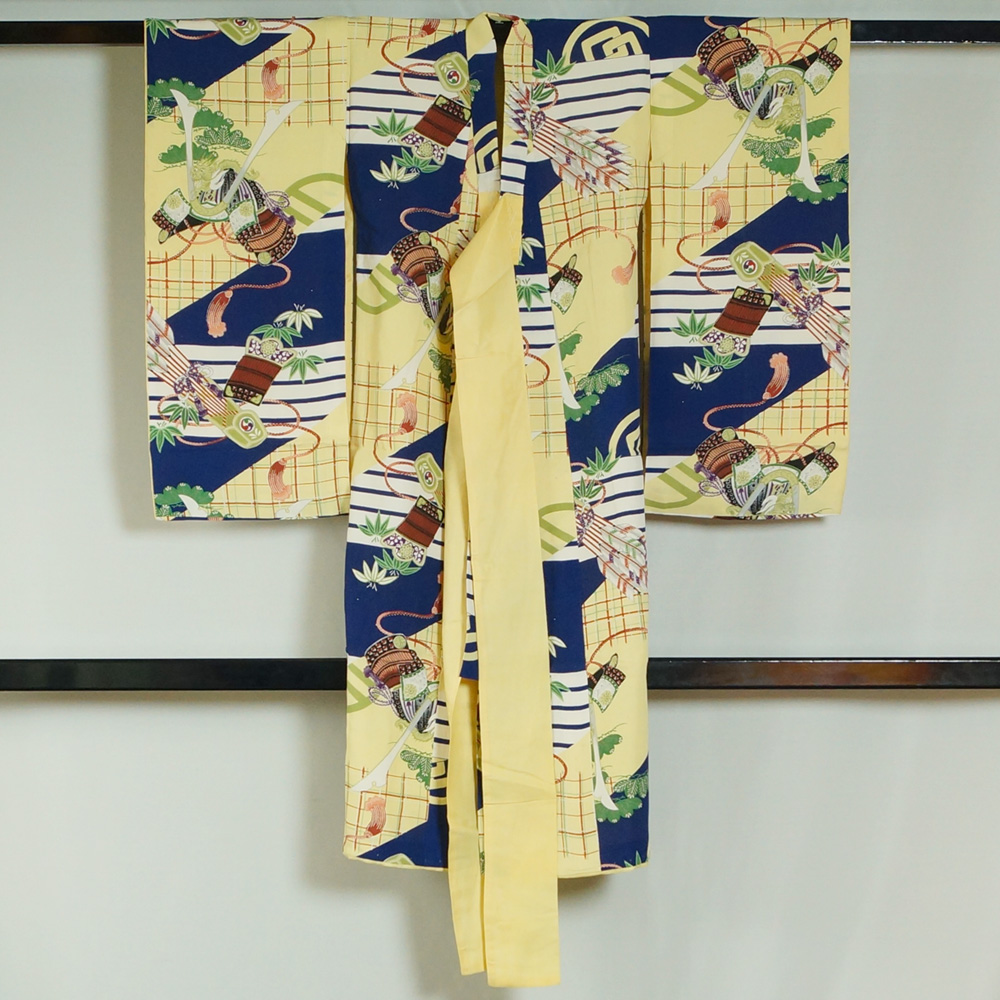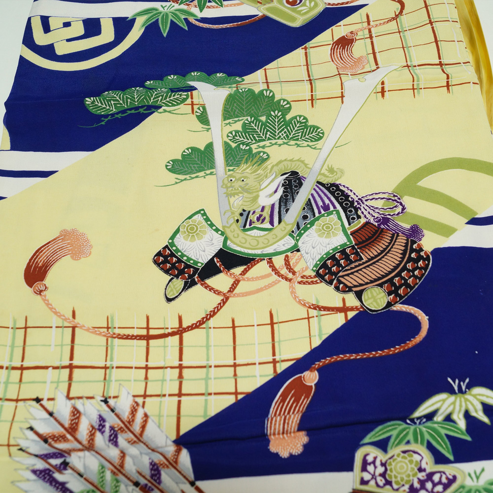 | 商品 説明 | 女郎花色系の地に兜や矢、松、格子などの模様が染められた男児用の産着です。長襦袢は付いておりません。 |