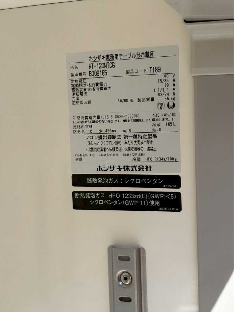 2022年9月新品導入 ホシザキ 台下冷蔵庫 コールドテーブル RT-120MTCG 幅1200×奥行450×高さ800mm 大阪府摂津市