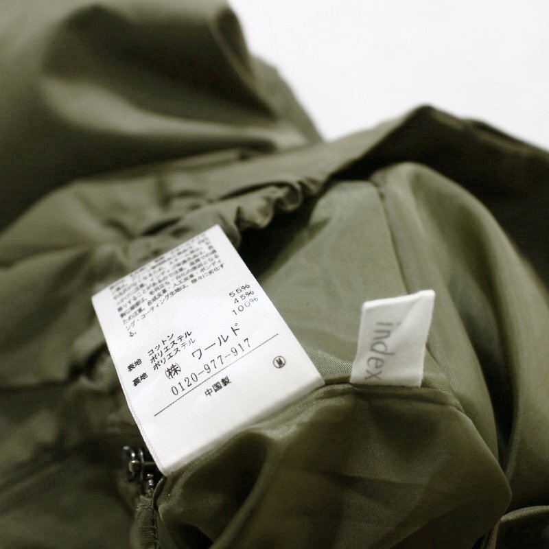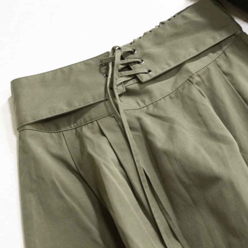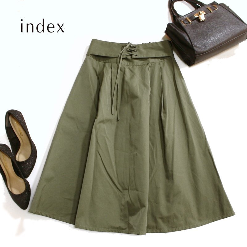 美品 index インデックス 株) ワールド 通年 ハリ 艶 ベルト一体 レースアップ ミリタリー ミディ フレアスカート M カーキ グリーン 緑