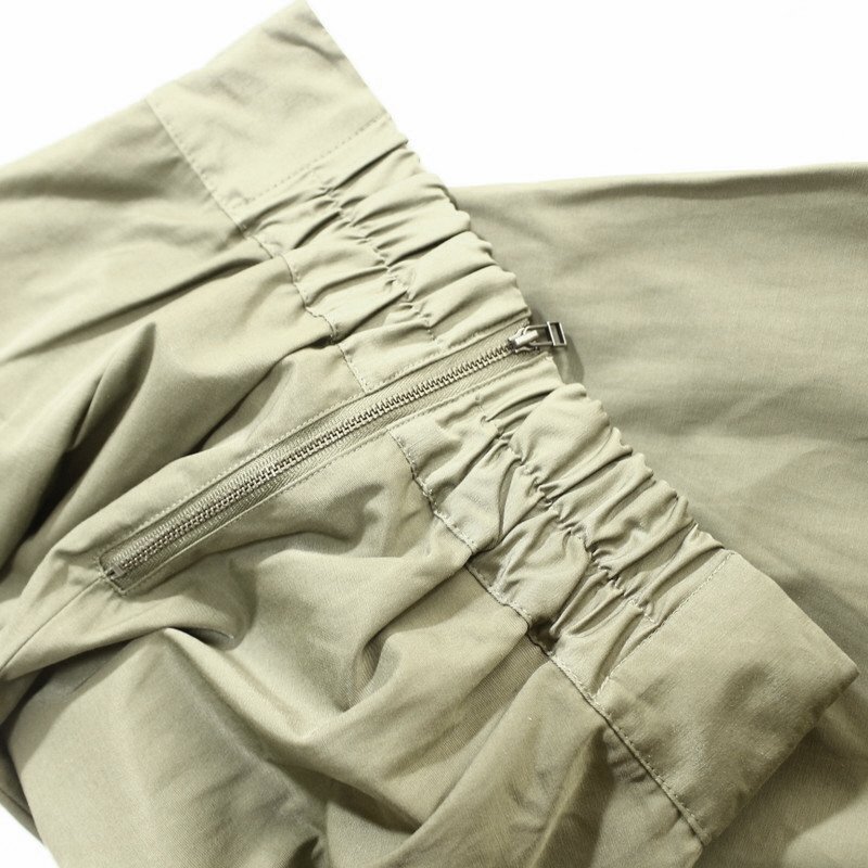ハリのあるコットン×ポリエステルの生地で長いシーズンご使用頂けます。ファスナーは後ろ中央、ウエスト片側ゴムギャザー、ポケットなしです。