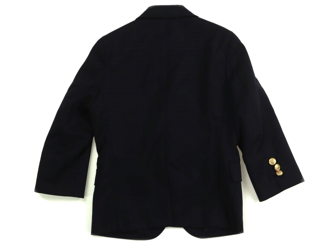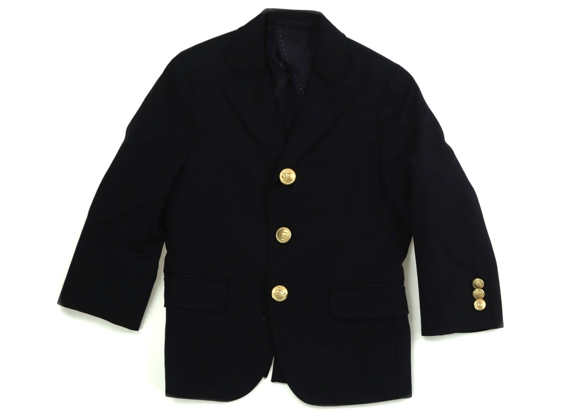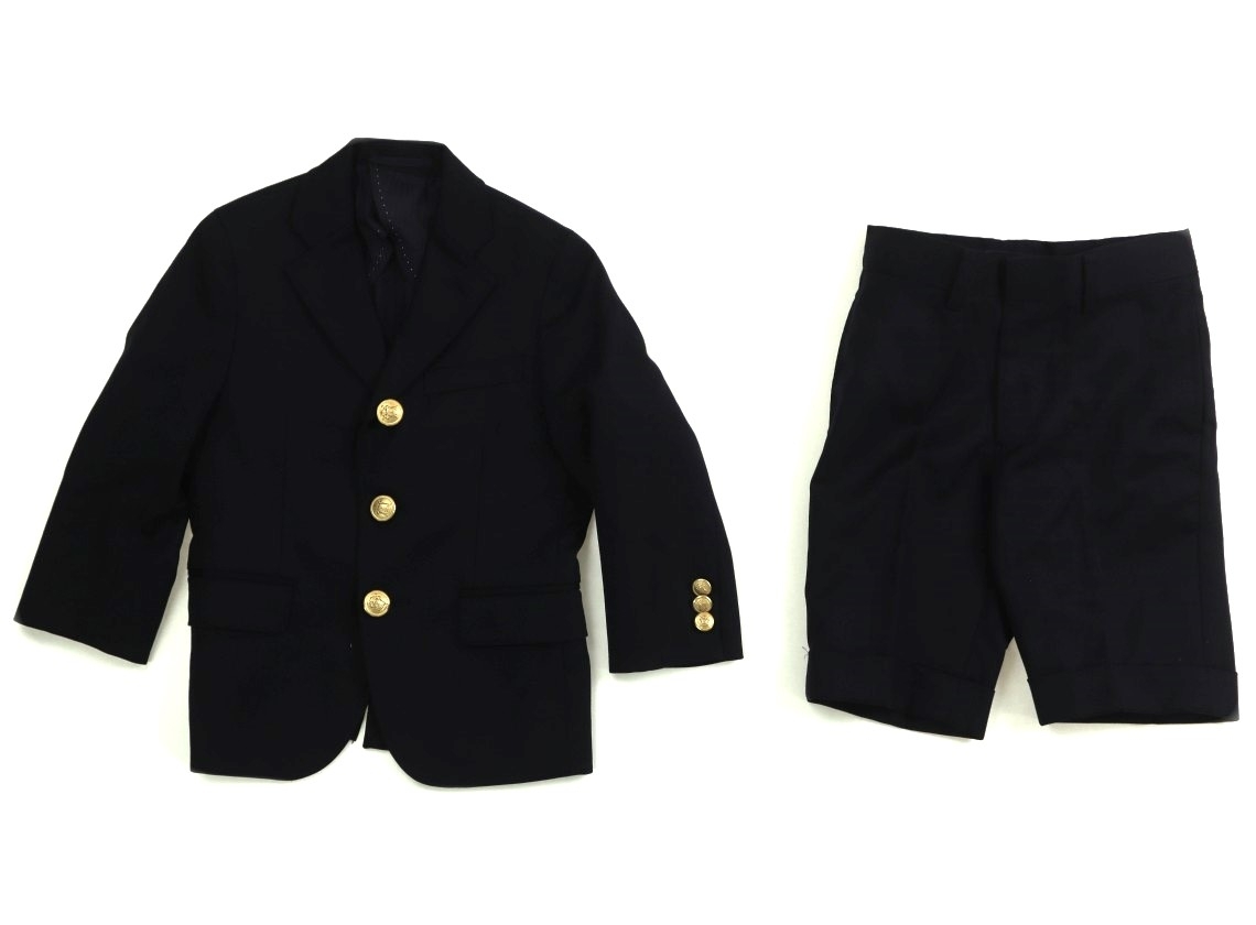サイズ違いの2点セット・ジャケット:110cmです。サマーウール生地で裏は背抜き仕立てです。袖裏はストライプ生地。センターベント。肩パットなし。胸箱ポケットあり。パンツ:100cmです。ジャケットと同素材で前パンツ側のみ裏地付き。股下実寸は約16cmです。裾Wカフス仕立て。後ろウエストにサイズ調整ゴムが付いています。センタープレスあり。目立つ汚れはありません。
