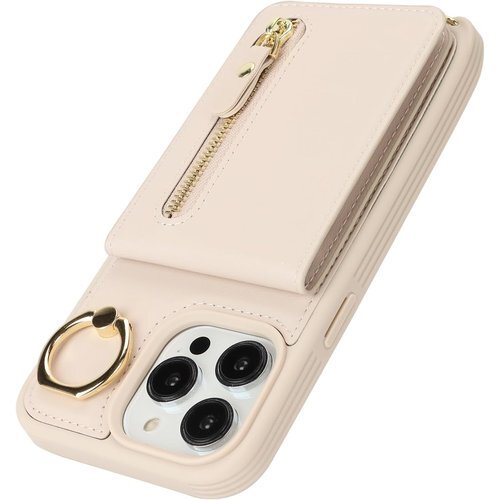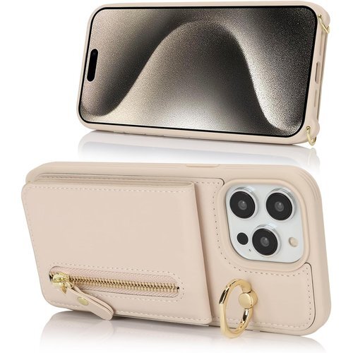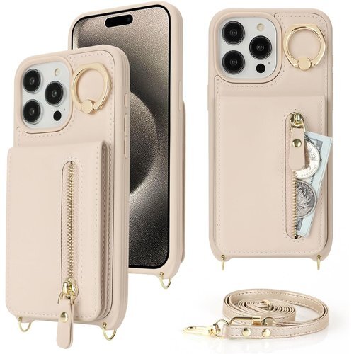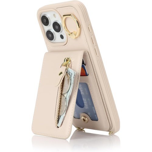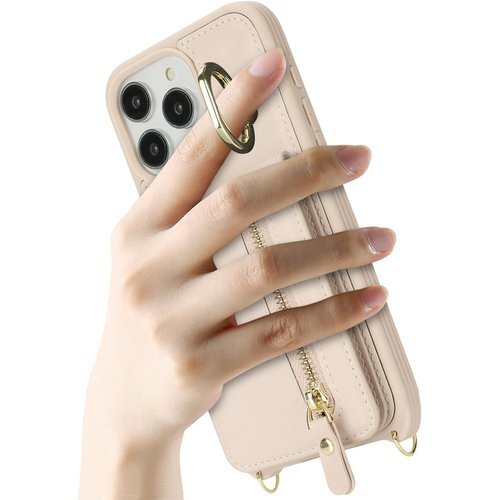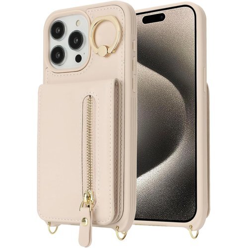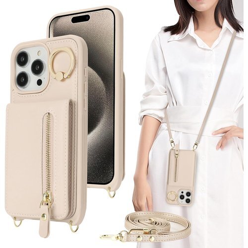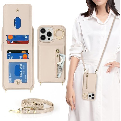 iPhone 15 Pro Max ケース ショルダー ストラップ付き ショルダーケース 背面フリップ 上下開 手帳型 アイホン 15プロマックス リング付き カバー スマホケース アイフォン15 pro max アイフォン 15プロマックス case 適用 iCoverCase リング付き カード収納 縦置き 横置き スタンド 肩がけ 首掛け 斜め掛け 携帯カバー ベージュ 1355