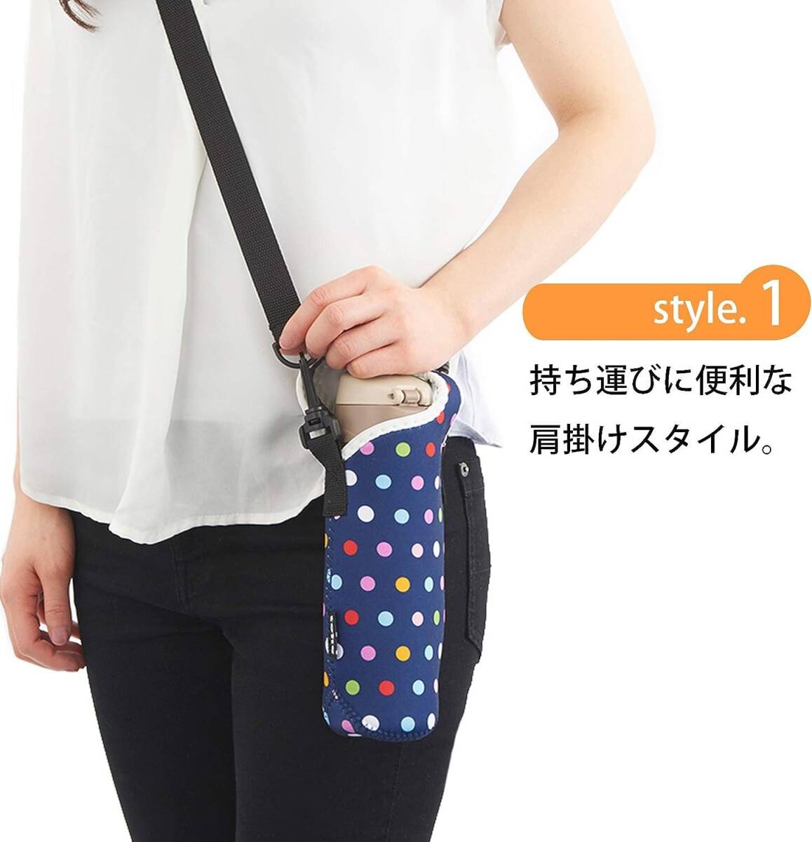 ショルダーベルトが脱着できるボトルカバー。 肩掛けスタイルにできるから持ち運びに便利。 ショルダーベルトは取り外し可能。また、外した状態でカラビナ付きボトルカバーとしても使えます。 カバー本体にはウェットスーツなどに使われる特殊素材を使用。クッション性・伸縮性があり、ペットボトルにもやさしくフィット。 直径7.5×高さ18.5cm(取っ手含む高さ約28cm)/重量:ボトルカバー本体:約50g 素材・材質:[表地・裏地]ポリエステル [中地]スチレン・ブタジエンゴム 生産国:中国 ●材質の特性上、ご使用当初はゴムのニオイがすることがあります。お使いになられているうちに薄れてまいりますが、気になる場合はしばらく風通しの良い所で干してからご使用ください。 ●製品に折れスジやへこみが生じている場合がありますが、これは素材の特性から発生するものであり品質には問題ありません。 ●本製品は内面、外面ともに防水仕様ではありません。冷たい飲み物を長時間入れておくと温度差による結露により水滴がしみ出す場合があります。また、落下や衝撃の際の内容物の保護はできません。お取扱いには十分ご注意ください。