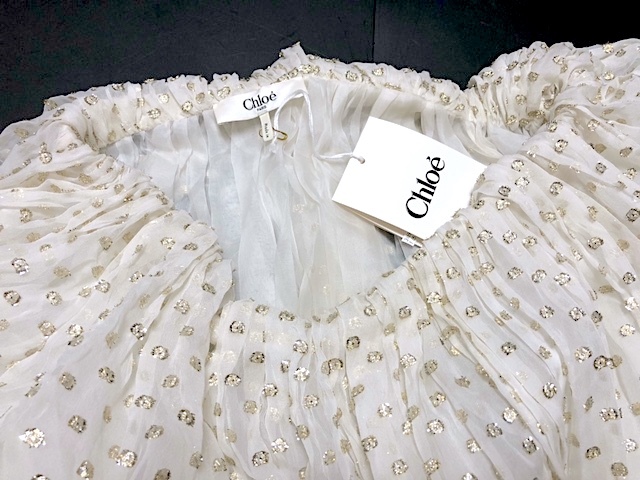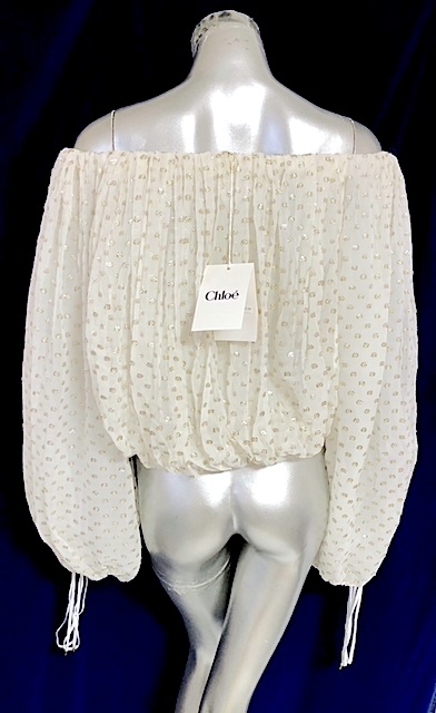 ☆二点落札で送料無料! 2A48【未使用/タグ付き】Chloe クロエ 25SS ランウェイ着用 ドット オフショルダー ブラウス 34 白 金 シルク