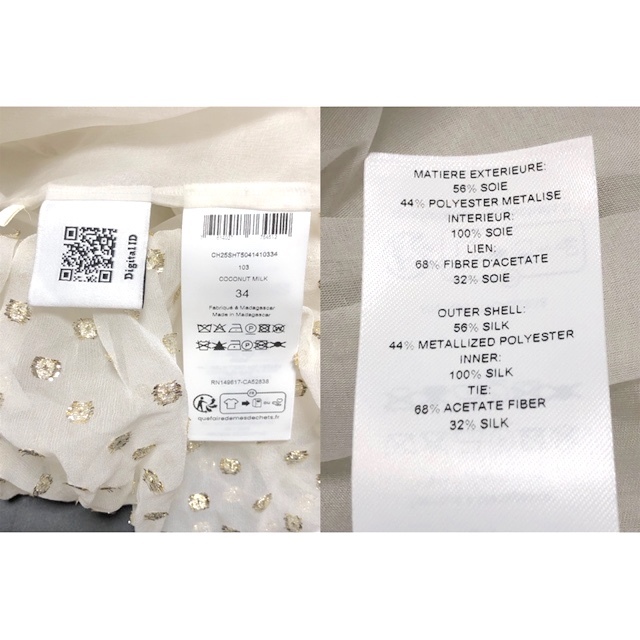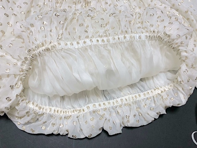 2025年春夏コレクションのランウェイにも登場した、非常に華やかでロマンティックな一着。透け感のある軽やかなシルク混の生地に、ゴールドのメタリックドットが織り込まれており、動くたびにキラキラと上品な輝きを放ちます。