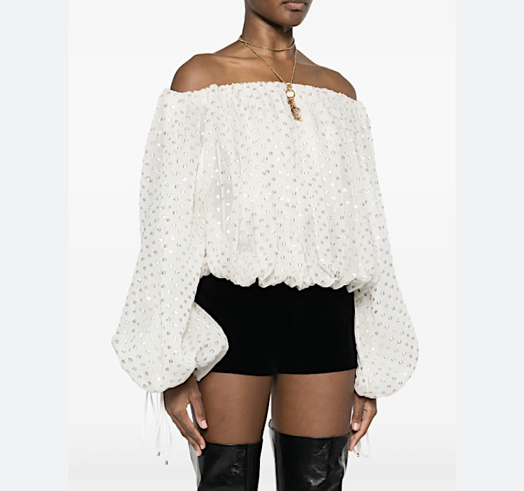 Chloe blouse paules dnudes en soie pois mtalliss blancs