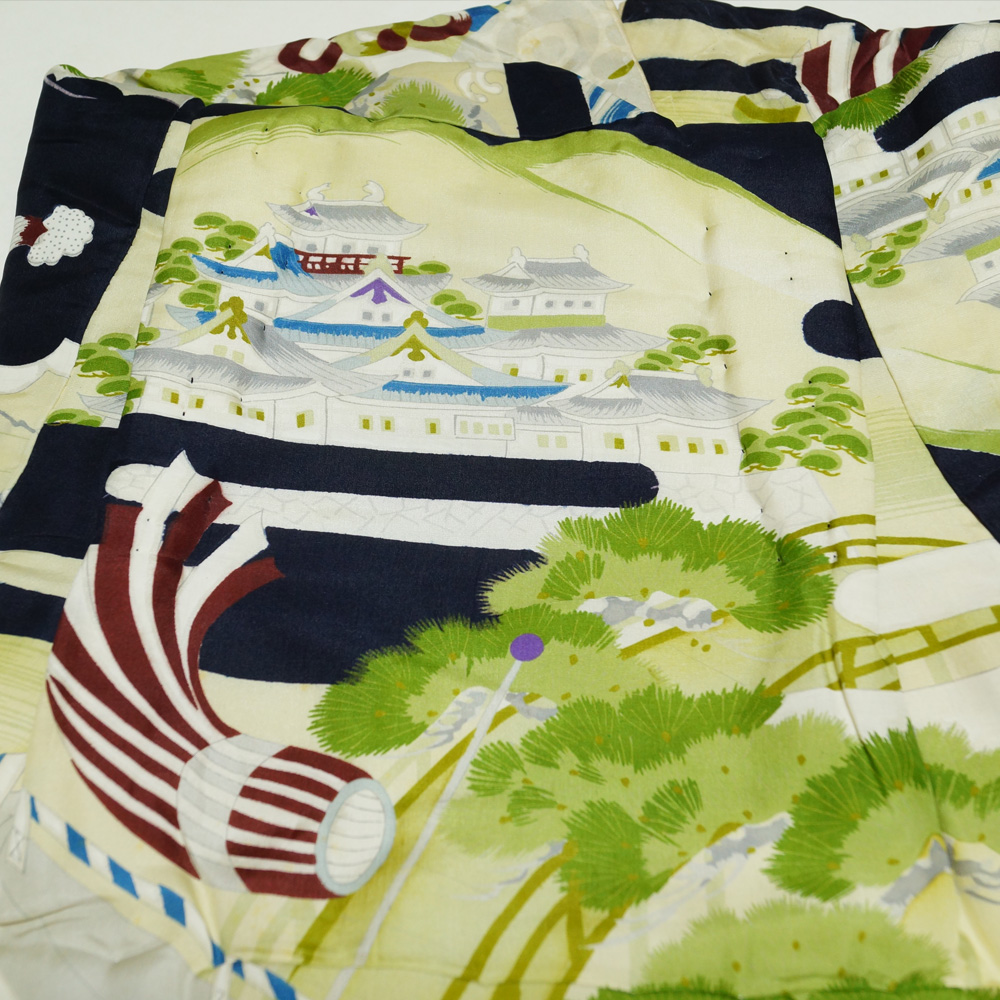 | 商品 説明 | 乳白色系の錦紗の地にお城に騎馬、松、槌などの模様が染められた男児用の綿入れ着物です。 こちらは産着や5歳用着物ではなく、サイズ的におどらくもっと小さな男児向けのお着物となります。 |