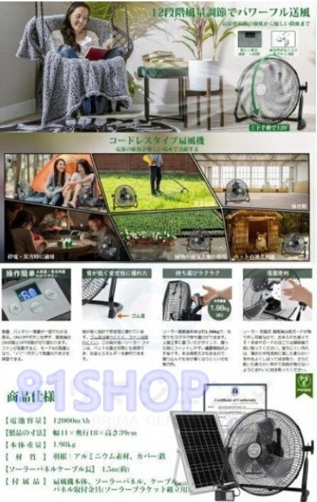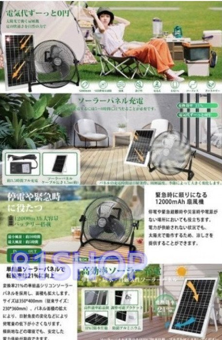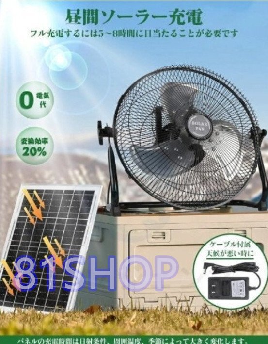 商品特徴 【2025改良モデル】充電時間(ソーラー充電時・晴天・直射日光):5時間~※ソーラーパネルによる充電時間は季節や天候等により変動いたします。本体扇風機のサイズ:横42cm×縦37cm×奥行き18cm;ソーラーパネルのサイズ:350*400mm。
