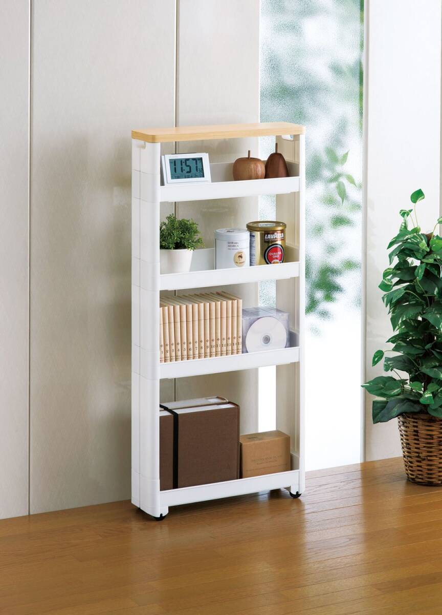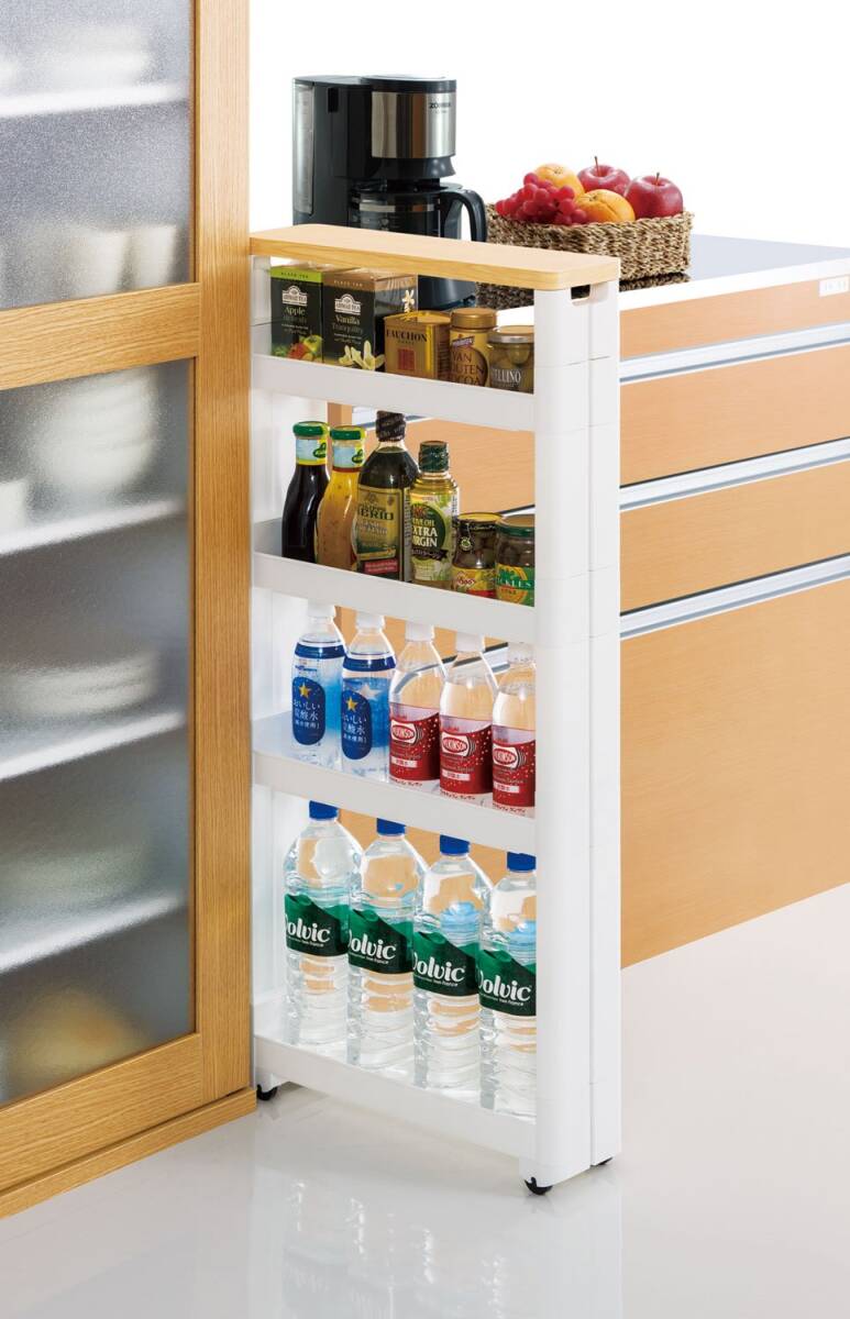 商品紹介 調味料やボトル類をスッキリ収納 より ●わずかな隙間が小物収納庫に変身! ●スタイリッシュな木製フラット天板