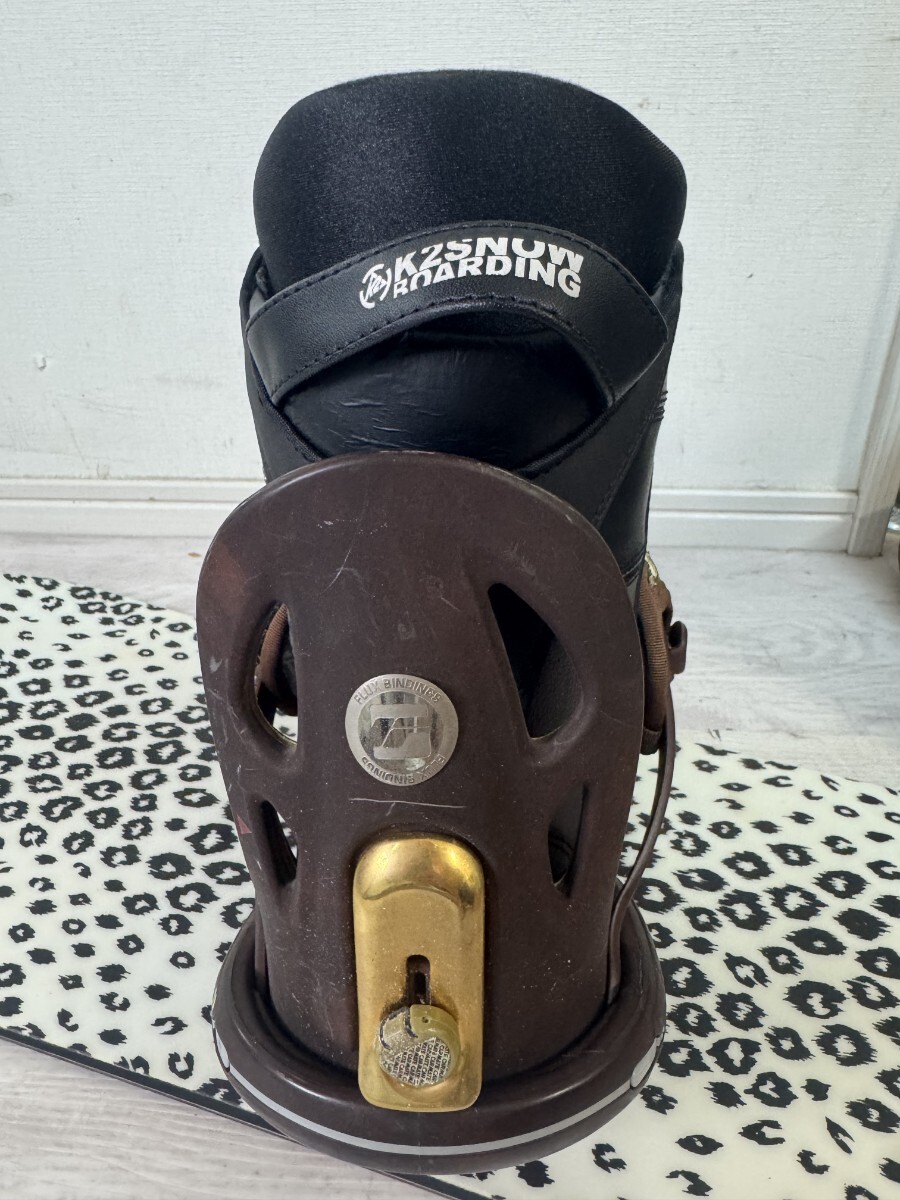 クリーニング済。ビンディング、ブーツ(25cm)付。ビンディングの布の部分の摩耗・スレあります。ビンディング経年劣化で、ボロいです。