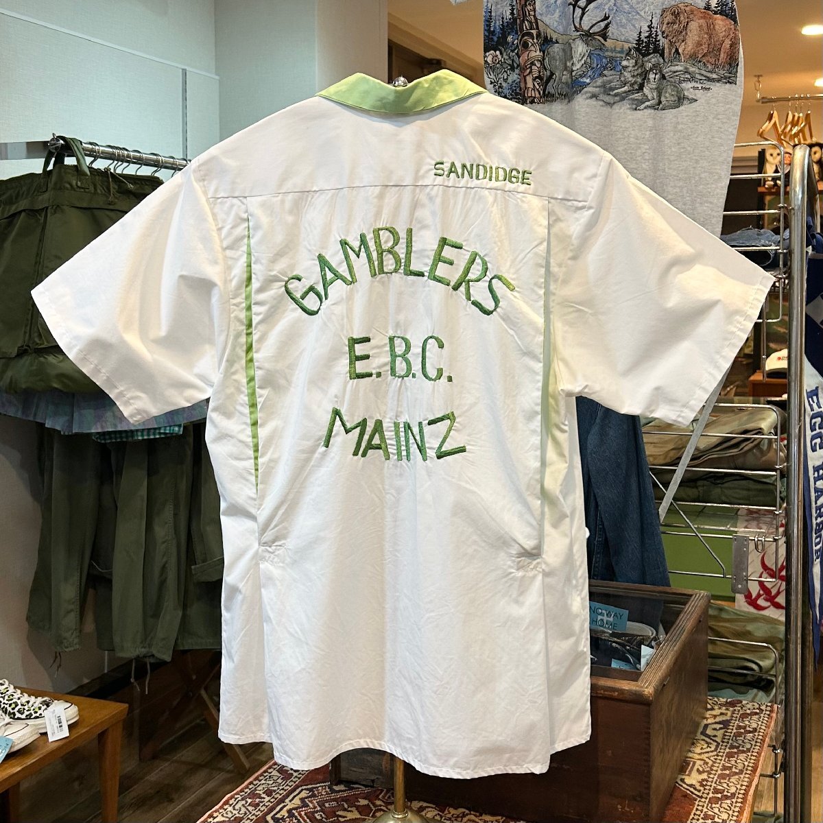 ~70’s ビンテージ HEGRA 白x黄緑 刺繍 GAMBLERS E.B.C MAINZ チェーンステッチ ボーリングシャツ M程度 EF1208-60-EG15