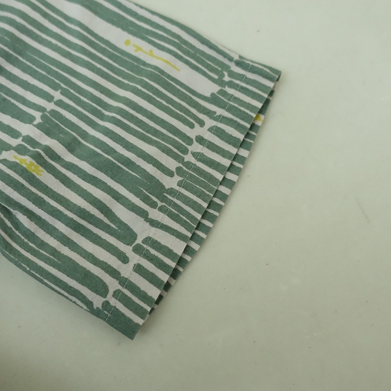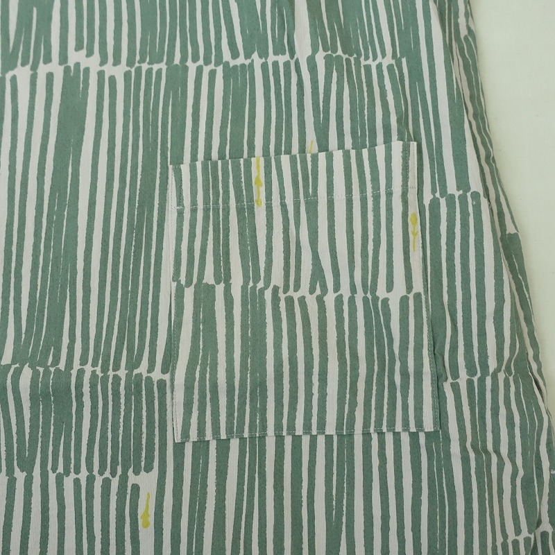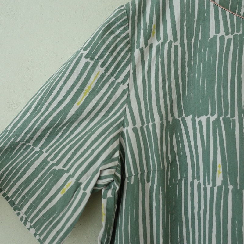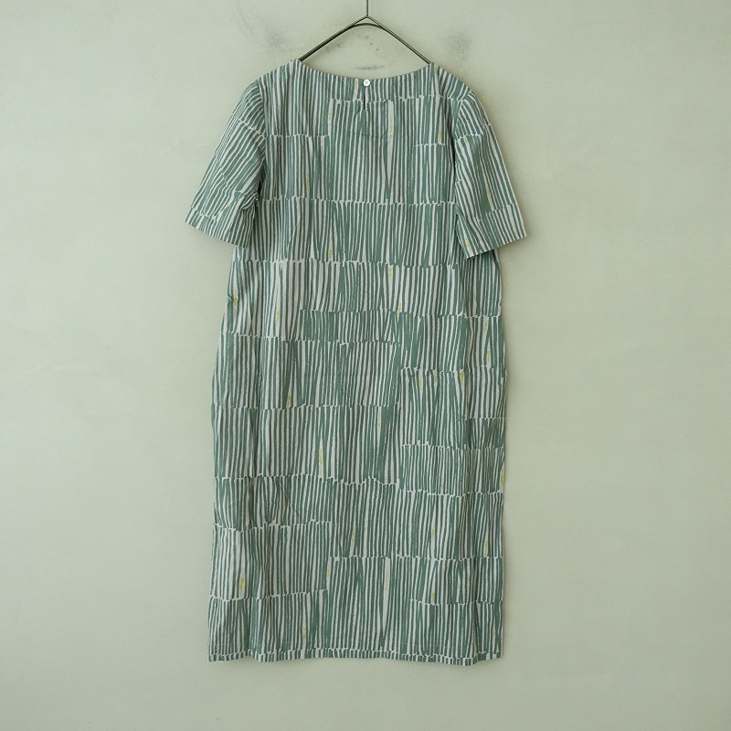 mina perhonen laundryの「hello!」プリントワンピースです。カラーは白地×セージグリーン・イエローです。細かなストライプの畦を配したサラリとした肌触りの良いコットン生地を使用。うっすら透け感がございます。背部1ボタン開きのプルオーバー仕様。ネックにはピンクのパイピングコードがあしらわれております。左腰にパッチポケット、両サイドにシームポケットがございます。定価(メーカー希望小売価格)46,200円の商品です。 |