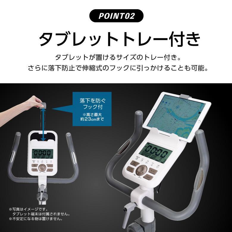 メーター部分にはタブレットの落下を防ぐ伸縮性のあるフックが付いたタブレットトレーを搭載し、タブレットやスマートフォンを置いて音楽や動画を楽しみながら運動が可能です。