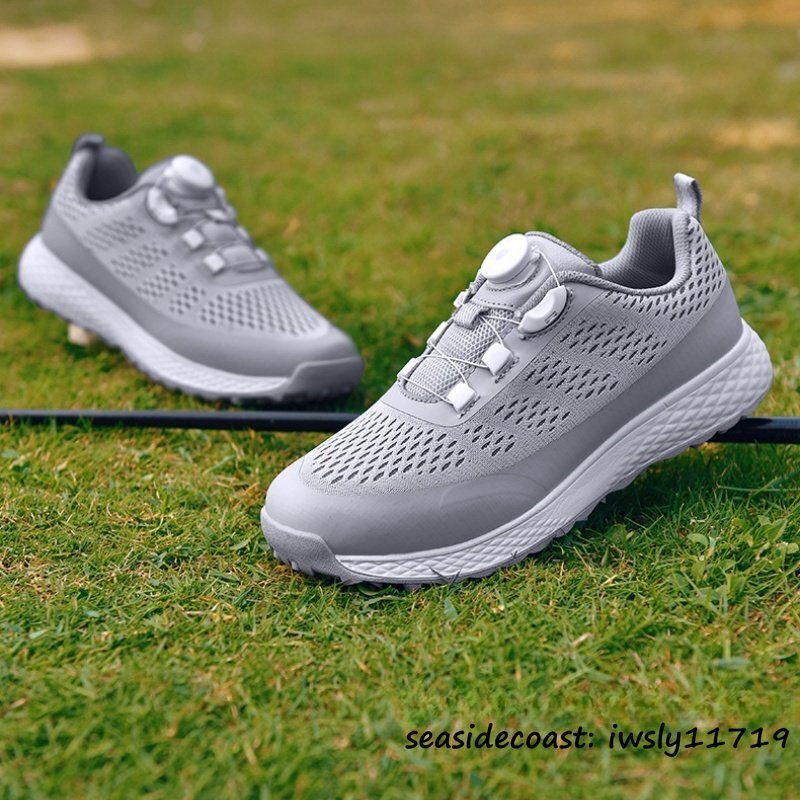 新品★メンズシューズ ゴルフシューズ 軽量 通気性 スニーカー メッシュ スポーツシューズ 運動靴 カジュアル 幅広 ダイヤル式 灰色 27.5cm