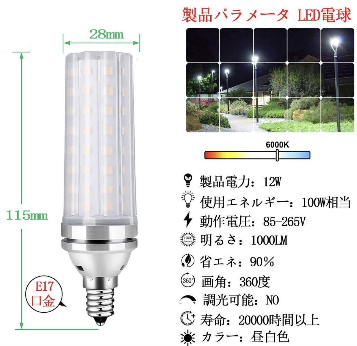 【製品仕様】口金:E17;寸法:直径28mmx高さ115mm;入力電圧:AC85-265V 50/60Hz;消費電力:12W、 白熱電球100W形相当;全光束:1000LM;色温:昼白色 6000K;演色性:Ra85+;照射角度:360° ;調光:非調光型(調光器又は調光器具に対応できないことを予めご了承下さい)