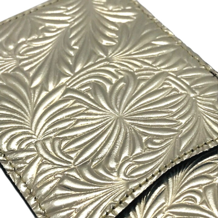 ひな菊の花と葉がモチーフの型押しで、光沢感とソフトな手触りが魅力です