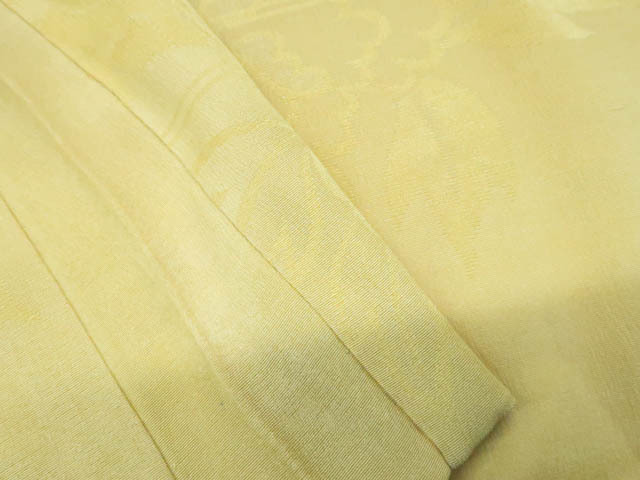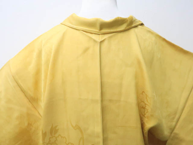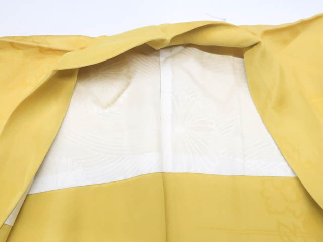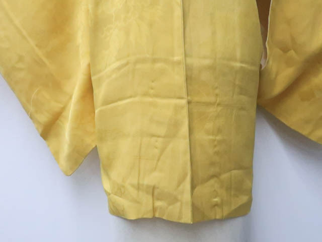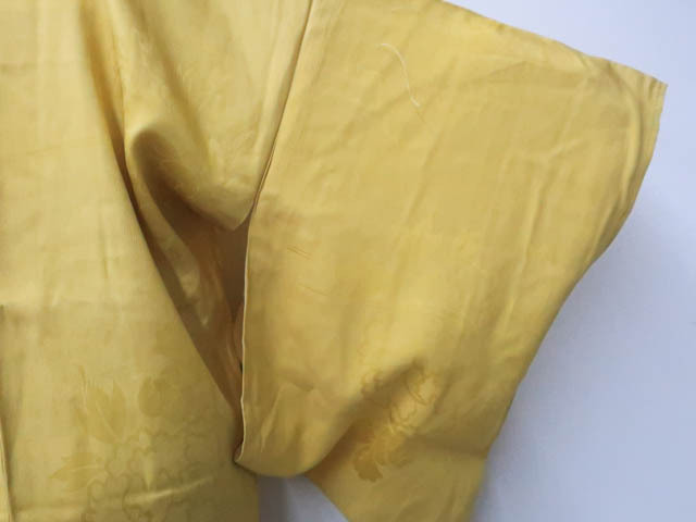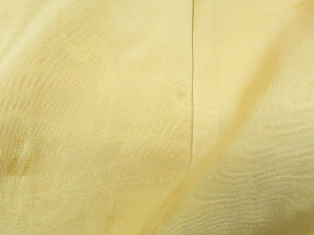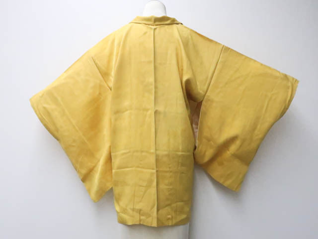 リサイクル商品のため、羽裏に薄いシミ、身頃、袖返しなど全体の所々にシミ、スレがございますが着用可能なお品です。 地色は、黄土色です。 1枚目の画像が近いお色かと思われます。 素材は正絹です。 |