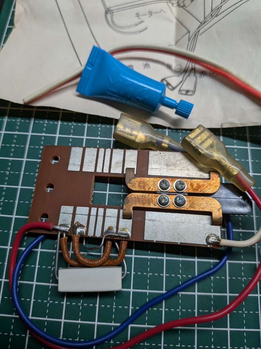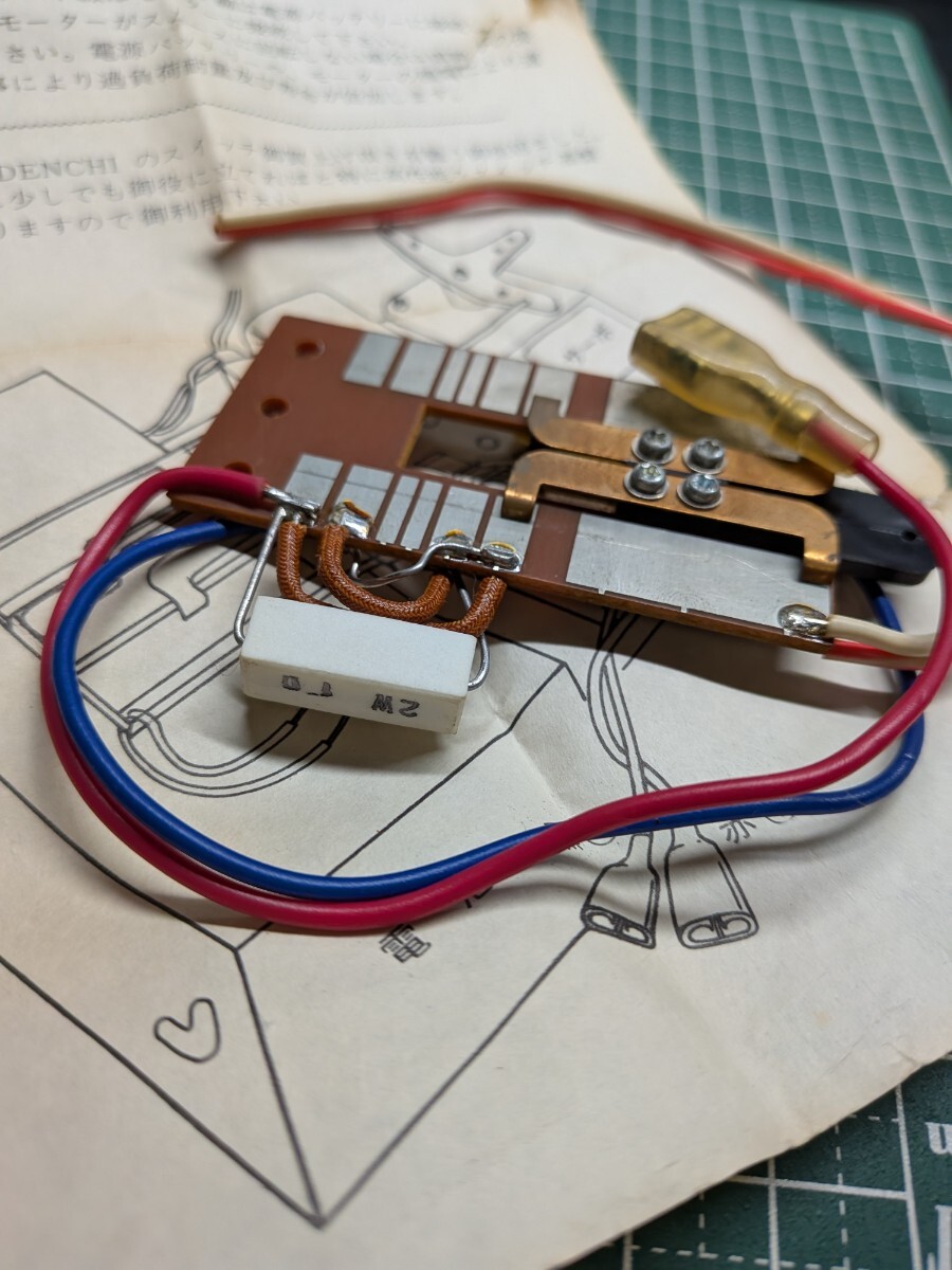 スライド式で片側に抵抗を追加できるような型をしています。2モーター可能な2段スピードコントローラーと思いますが前進3段後進2段に改造できそうにも見えます。