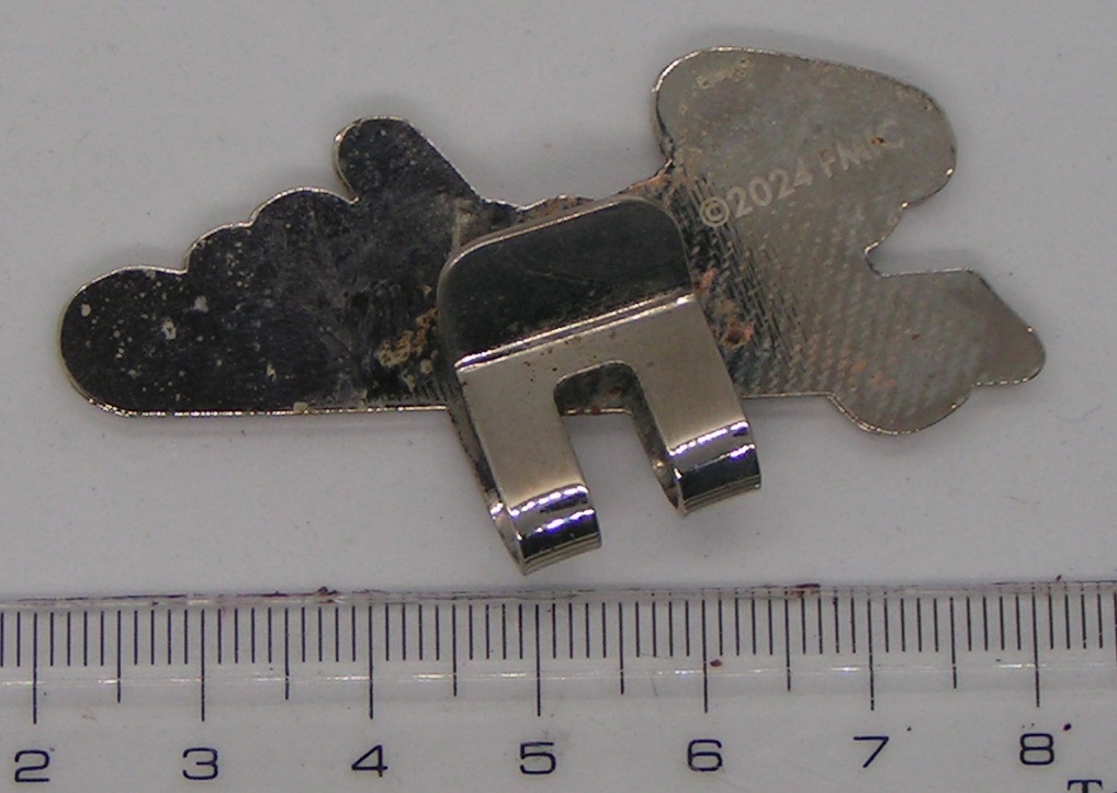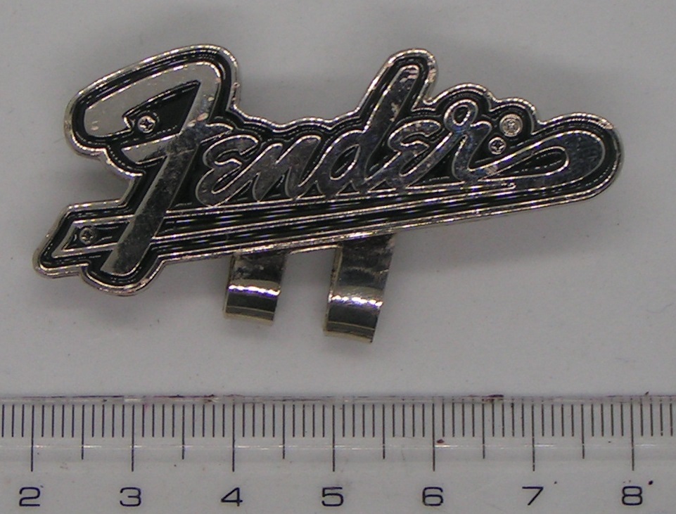 ギターメーカーのフェンダー (Fender) のロゴの金属製品です。
