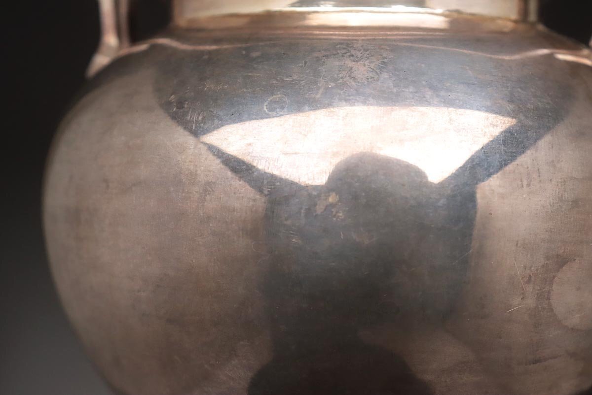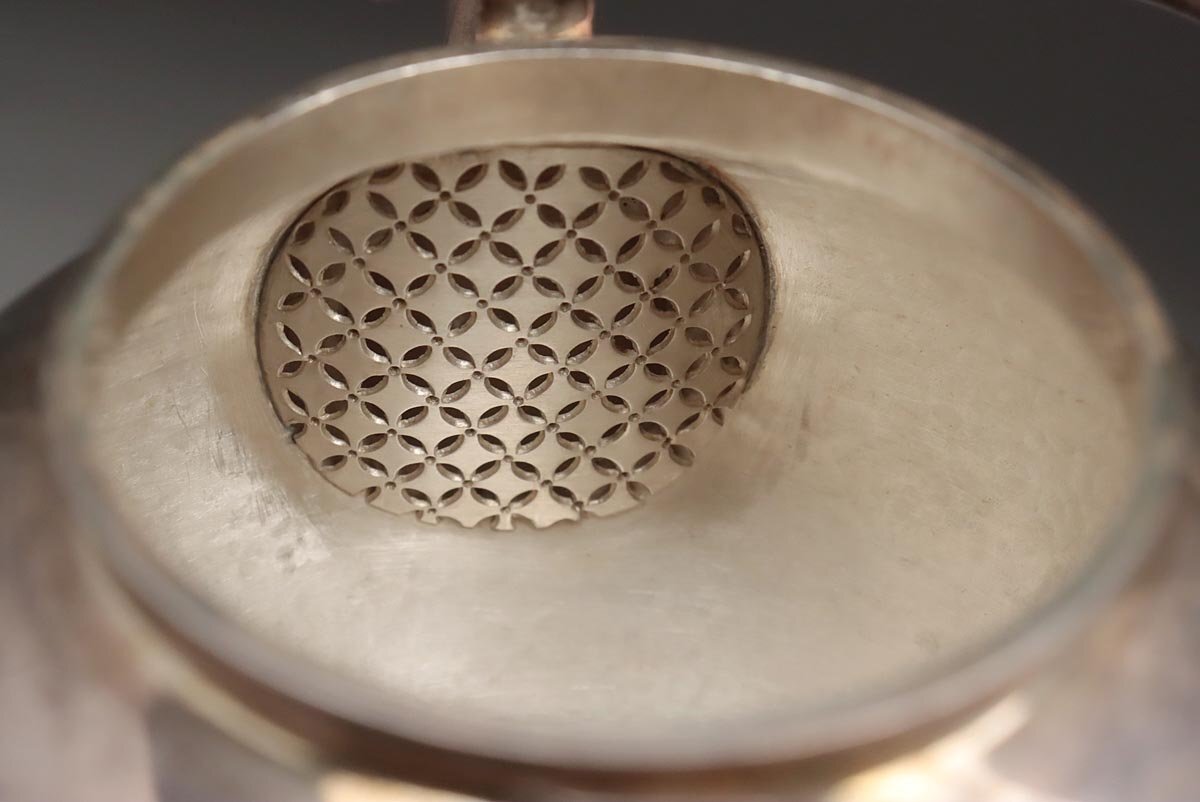 |        ◆ 時代金工【秋田 渋谷製】純銀 菊摘 銀急須 高15.3cm 重298g 純銀刻 水漏無 木箱附・純銀瓶・煎茶 湯沸 茶具 煎茶道具 ◆