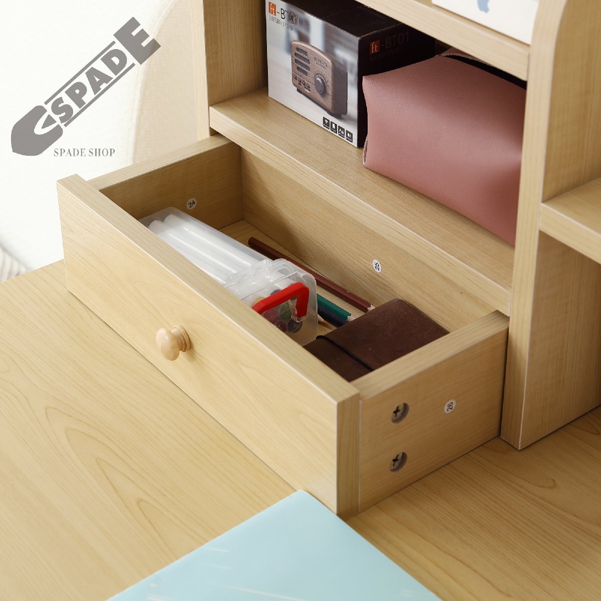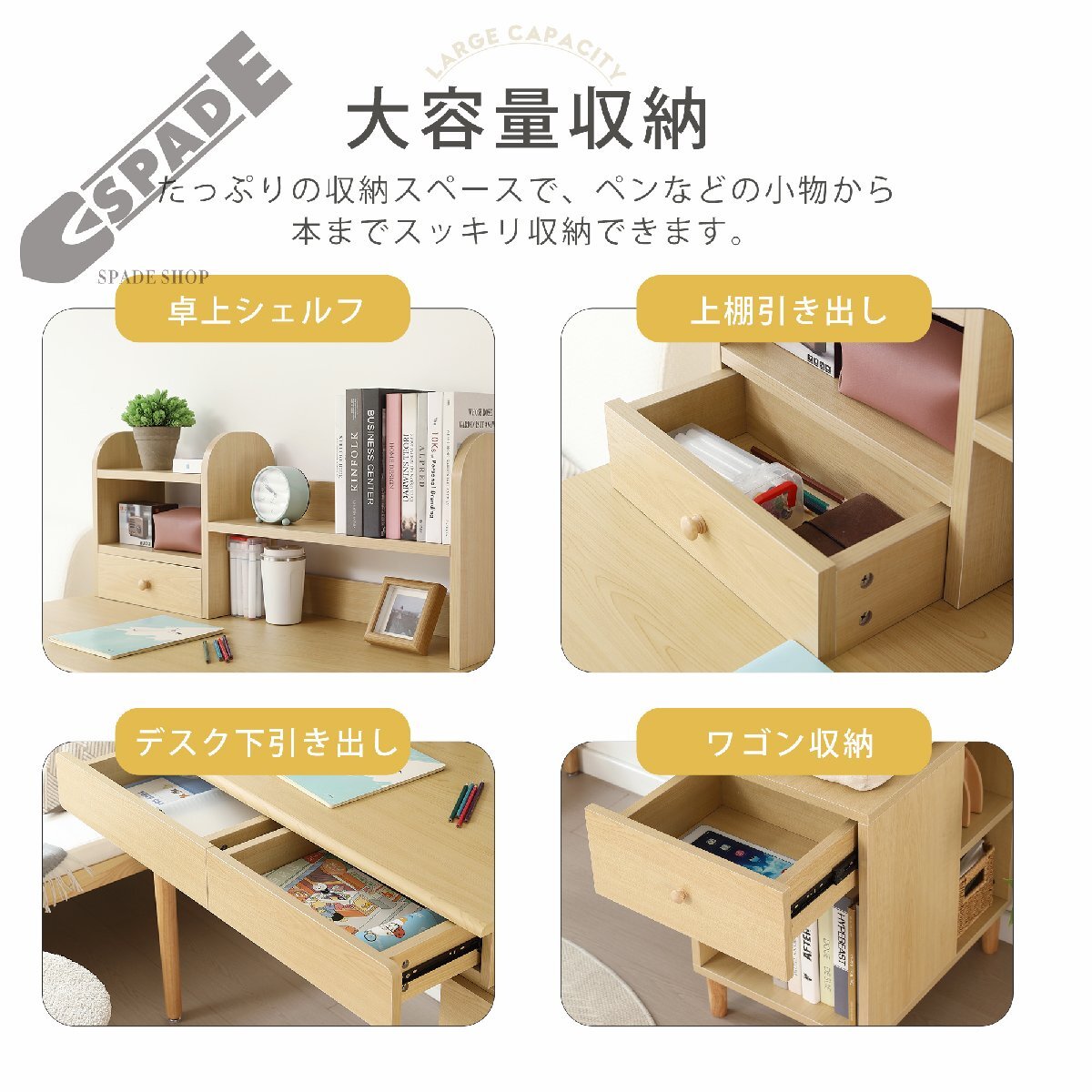 • 【大容量収納】たっぷりの収納スペースで、ペンなどの小物から本までスッキリ収納できます。卓上シェルフ+上棚引き出し+デスク下引き出し+ワゴン収納
