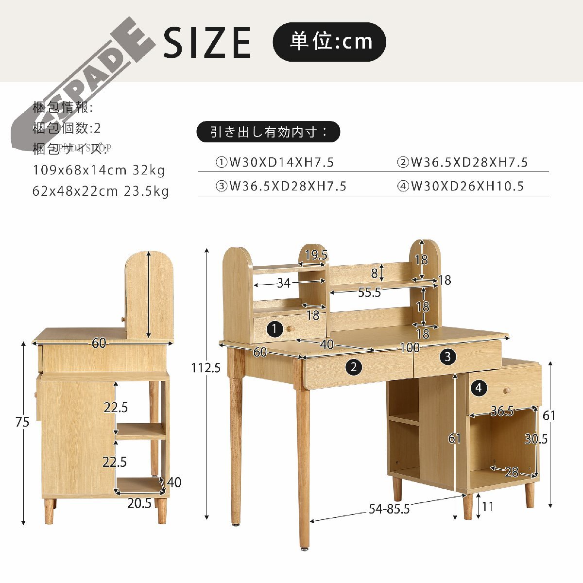• 仕切り棚があるので、本やノートなど分けて収納できます。+卓上の引き出しはよく使う小物などを収納するには最適です。+デスク下には引き出し2杯付きです。スライドレール仕様のため、スムーズに開閉できる上、抜け落ちの心配もありません。+収納力抜群なワゴン手前と奥側に仕切り棚があり、さらに引き出しも付いているため、書や文房具など様々なアイテムをたっぷり収納できます。A4サイズ対応できます。+奥側にも収納スペースに