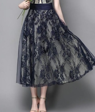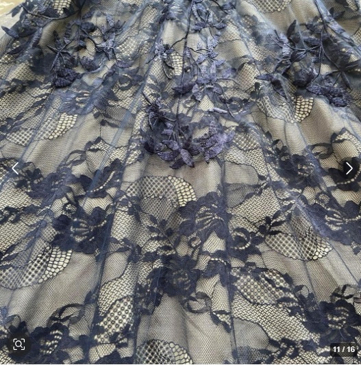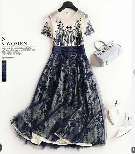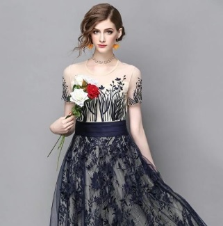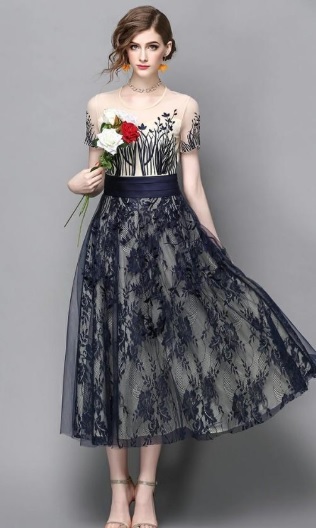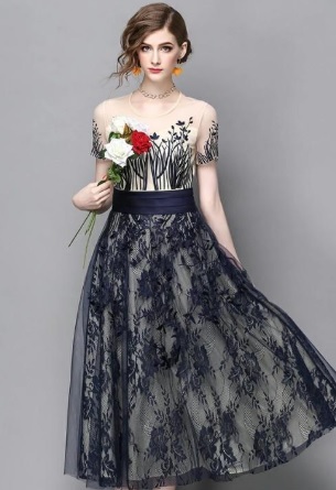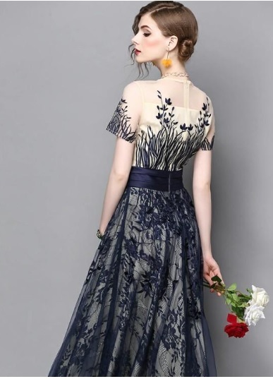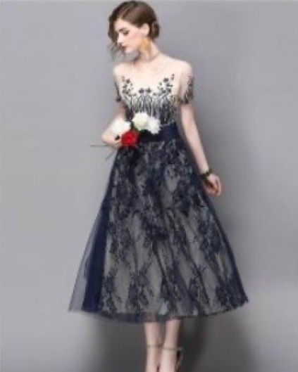 ボタニカル柄レースミディアムドレス。シャンパンゴールドのサテンの下地の上に、紺のボタニカル柄刺繍をほどこしたレースが重ねられ豪華でフェミニンなデザインです。デコルテラインから肩にかけての透け感が大人の雰囲気を醸し出し、シックで上品な女性を表現。パーティやイベント、コンサート、結婚式にと、さまざまシーンで活躍してくれる美しい一着。背中ファスナー有。裏地付。