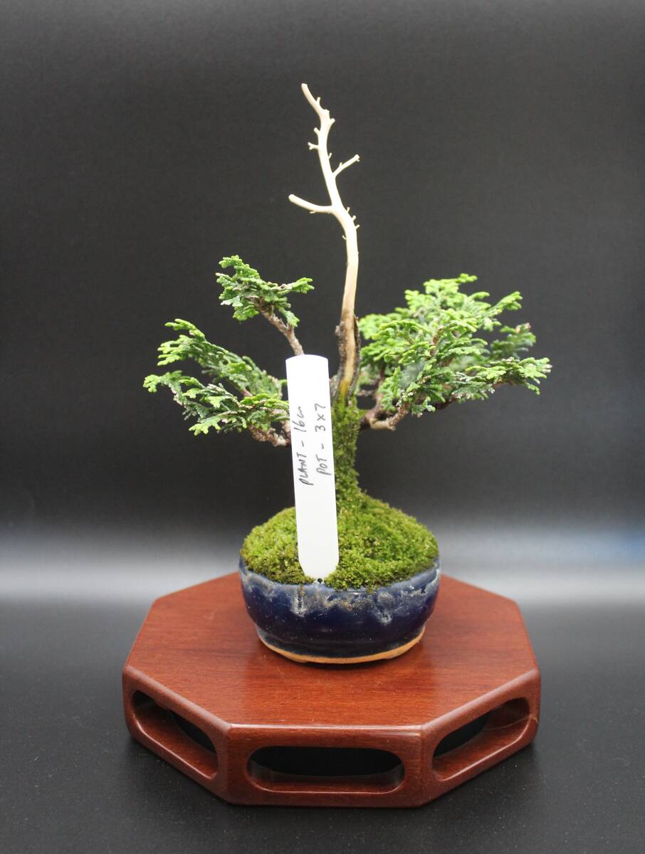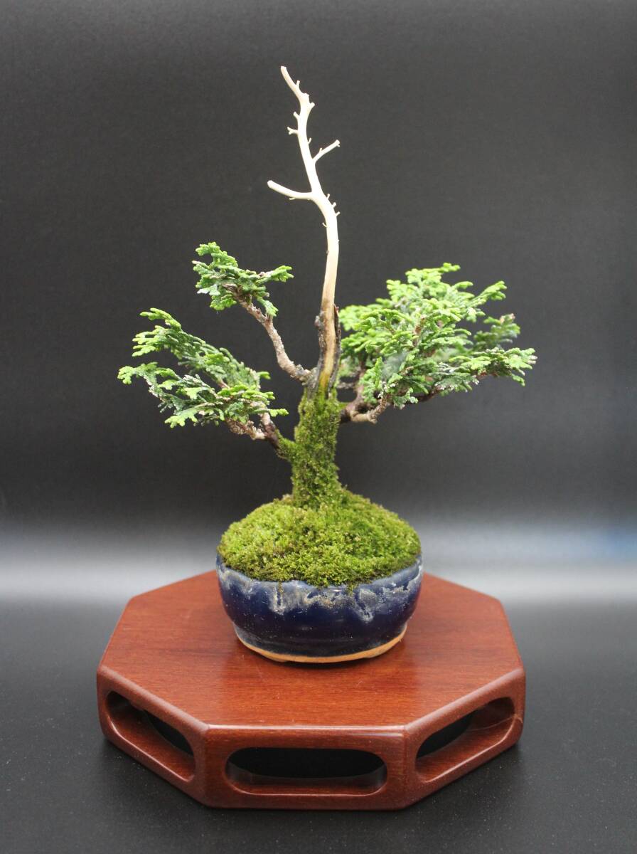 【ミニ盆栽】檜(ヒノキ)|深青色の手作り鉢|樹高:約16cm|鉢サイズ:高さ3cm・直径7cm