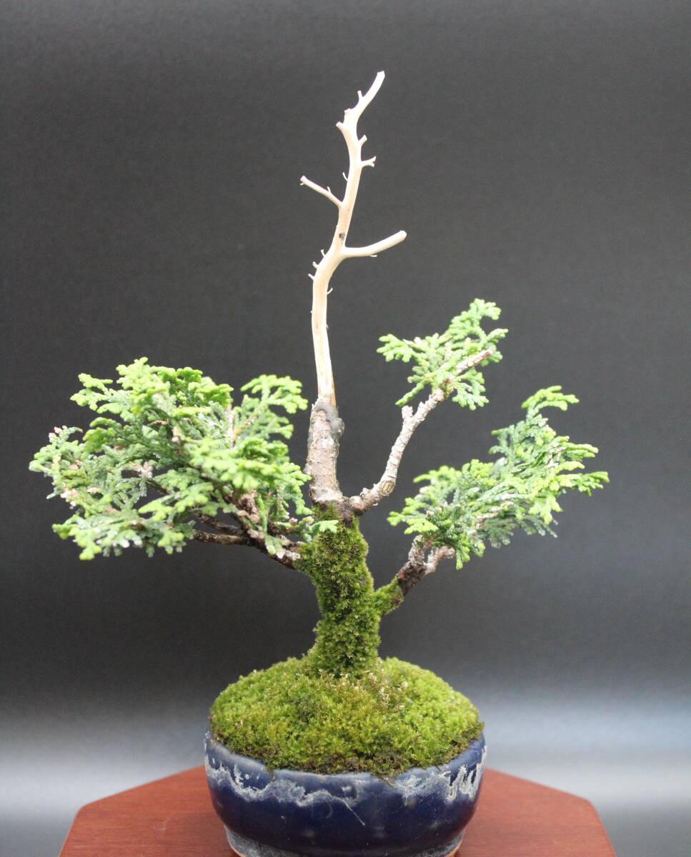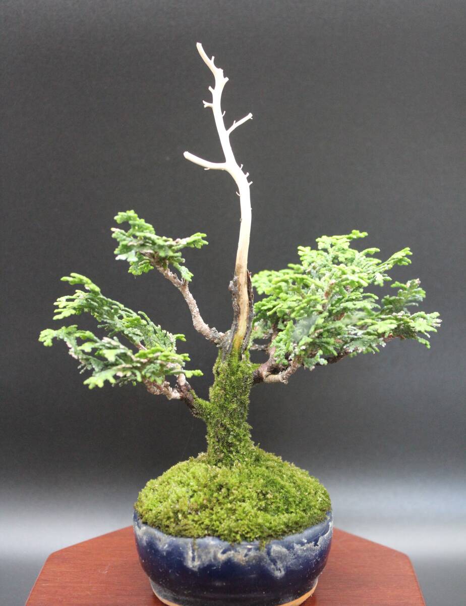 こちらは、人気の**檜(ヒノキ)**を使った手作りのミニ盆栽です。扇形の葉と落ち着いた佇まいが魅力で、**天然のジン(舎利枝)**が風格と年輪を感じさせる一樹です。