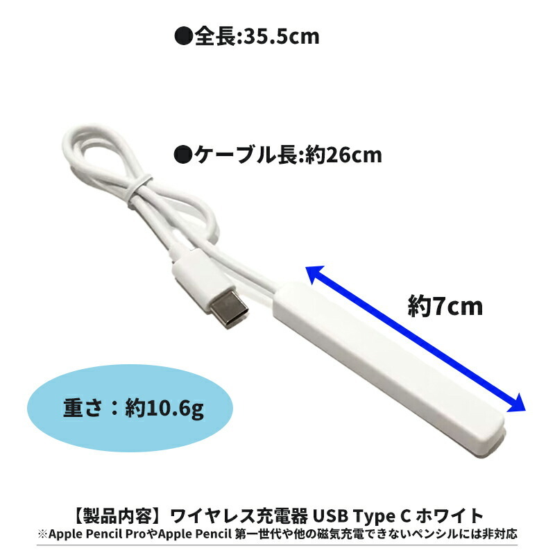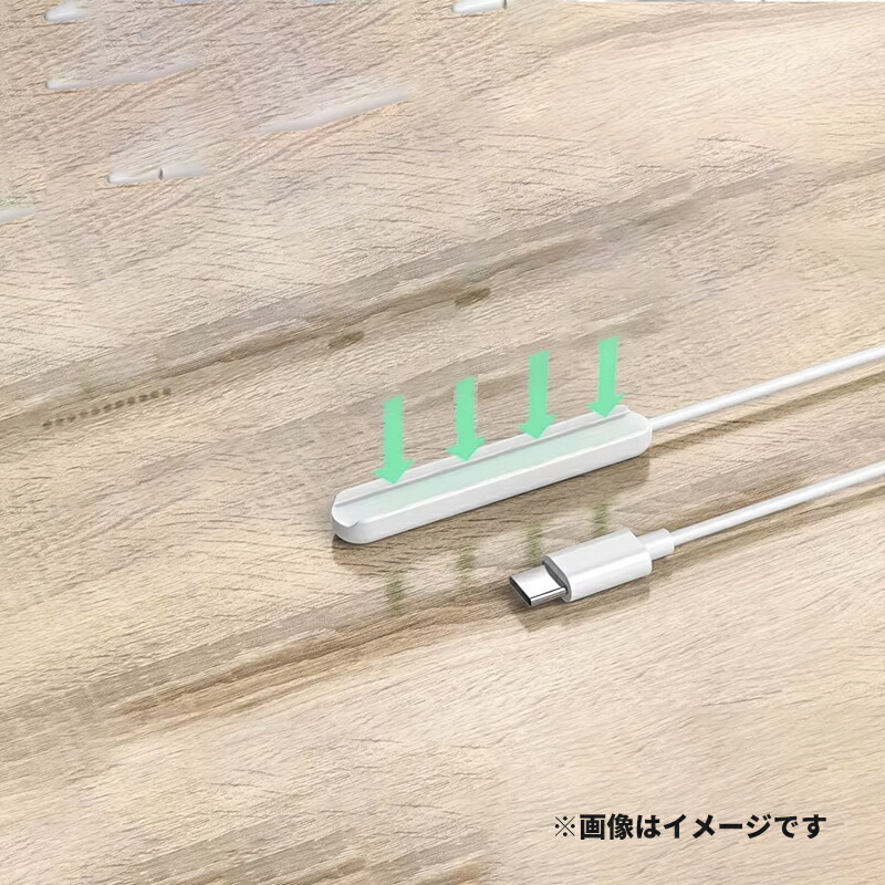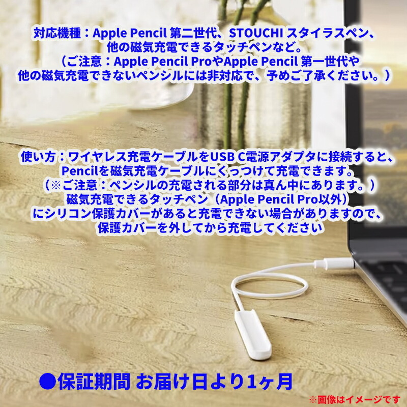 使い方:ワイヤレス充電ケーブルをUSB C電源アダプタに接続すると、Pencilを磁気充電ケーブルにくっつけて充電できます。(※ご注意:ペンシルの充電される部分は真ん中にあります。)