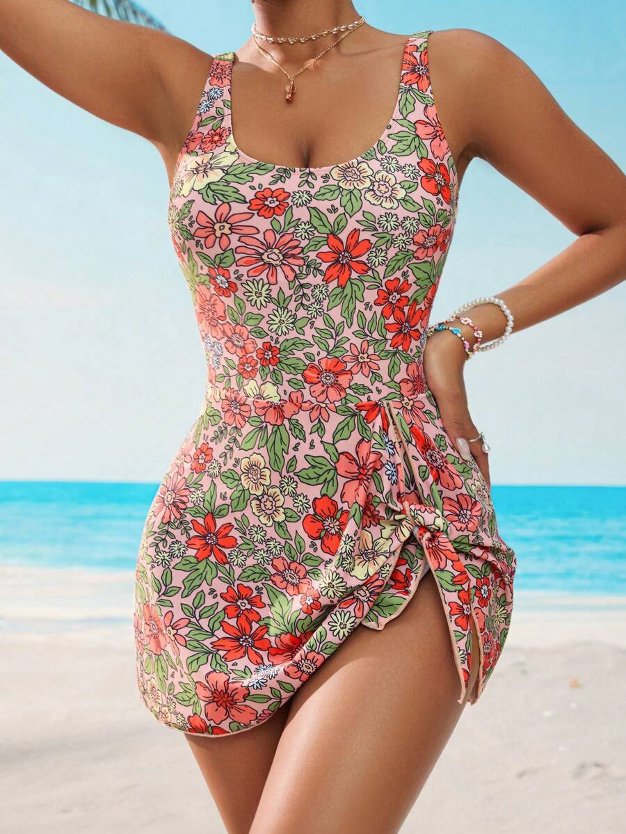 レディース 水着 ワンピース エレガントな花柄ワンピース水着 スカート付き 字ネック スリミング & 太もも カバー
