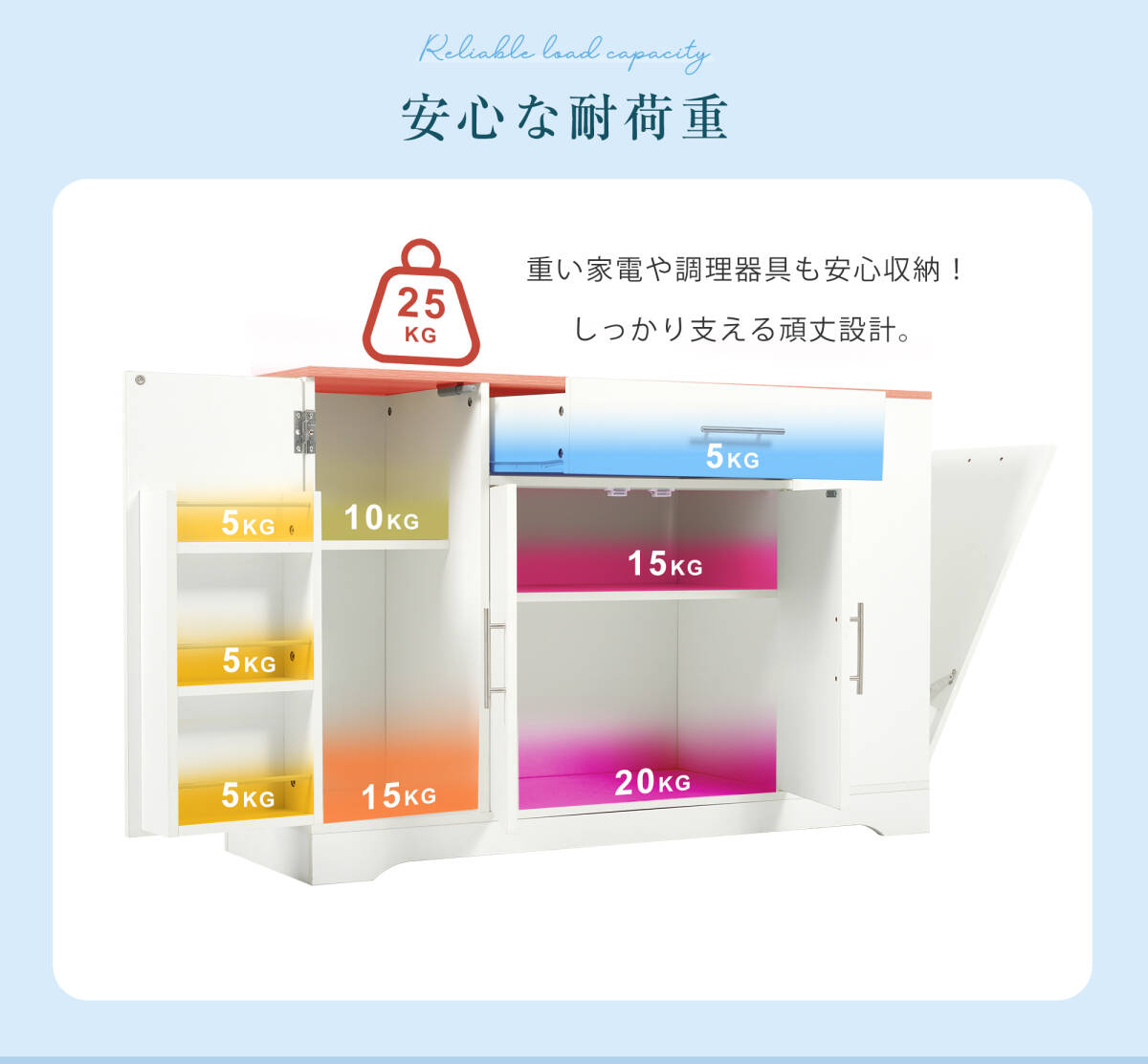 • 【安心な耐荷重 】重い家電や調理器具も安心収納! しっかり支える頑丈設計。引き出しで取っ手が付いているの で、引き出しを開けてラクにものを取ることができる