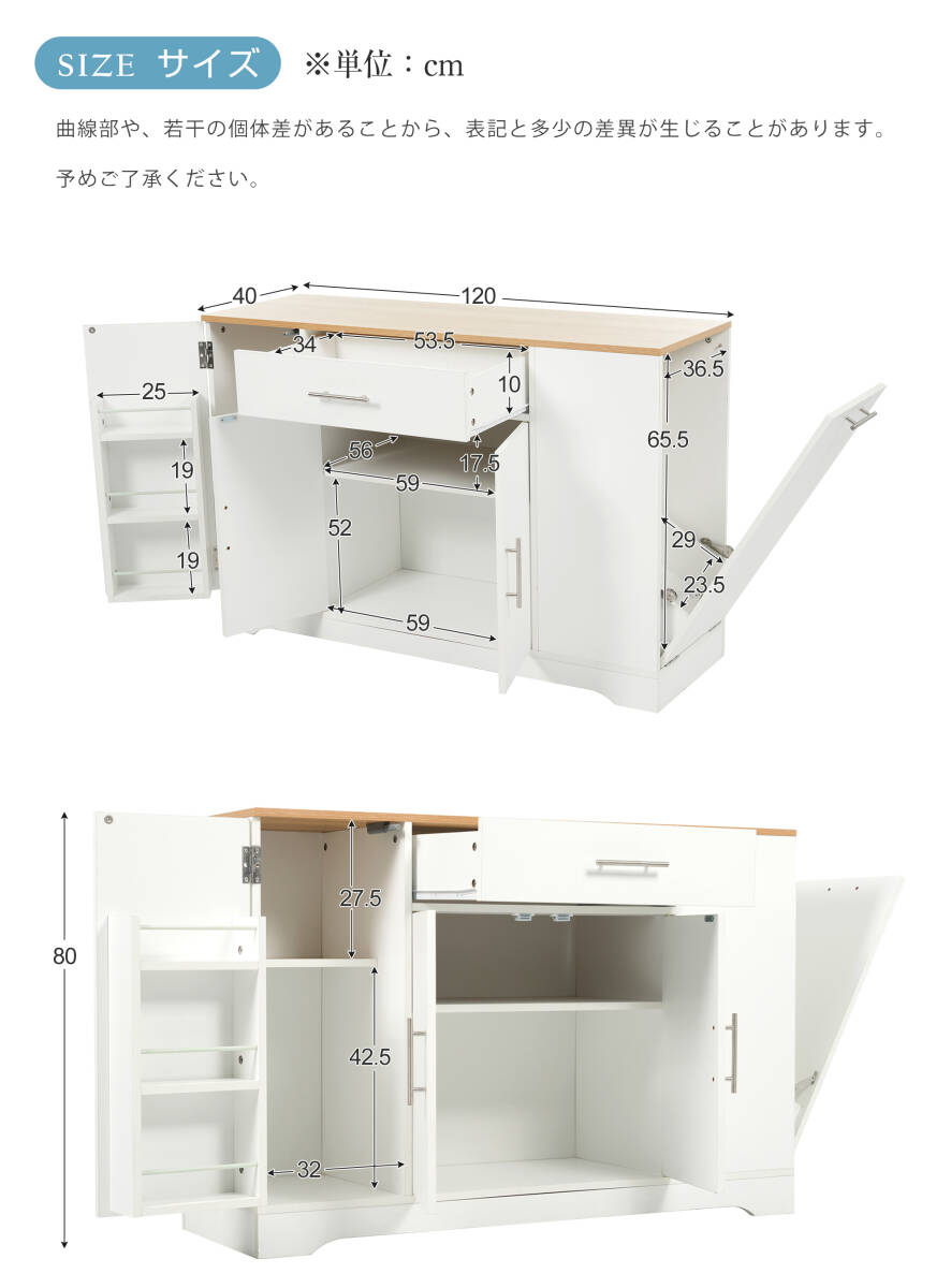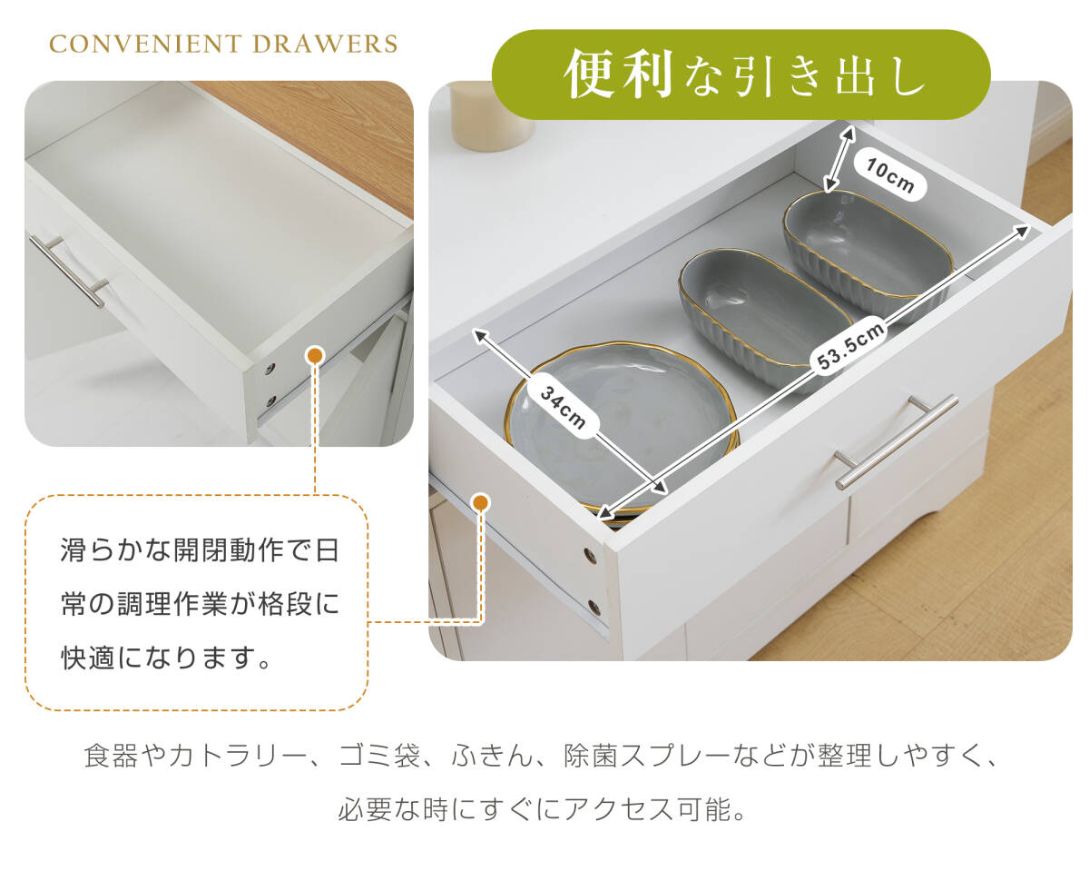 • 【便利な引き出し】食器やカトラリー、ゴミ袋、ふきん、除菌スプレーなどが整理しやすく、必要な時にすぐにアクセス可能。滑らかな開閉動作で日常の調理作業が格段に快適になります。