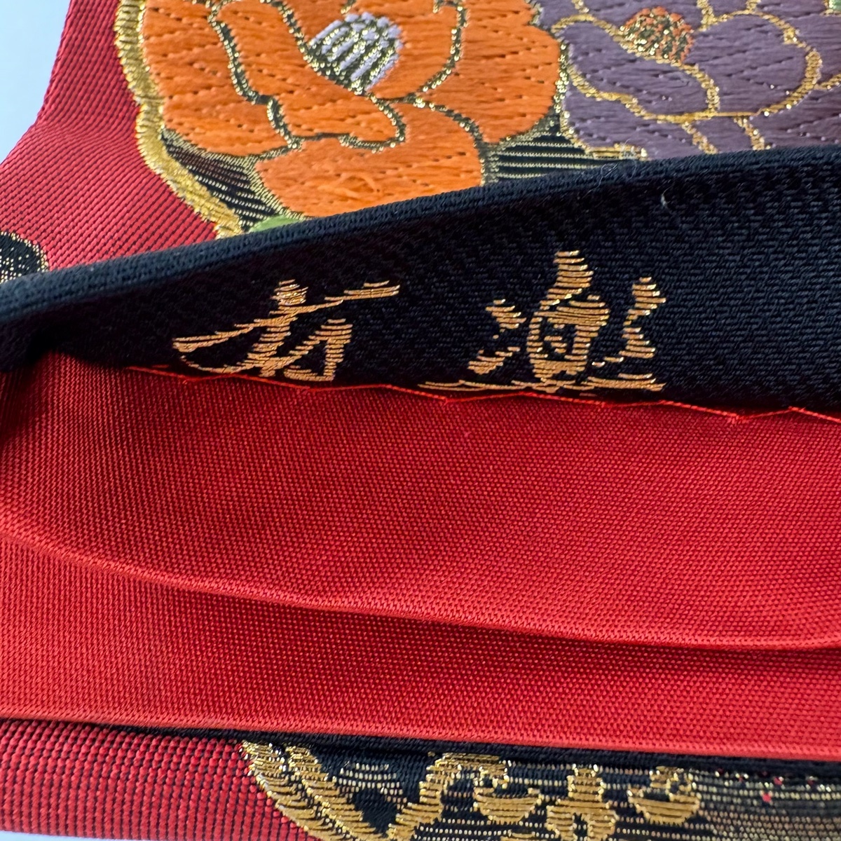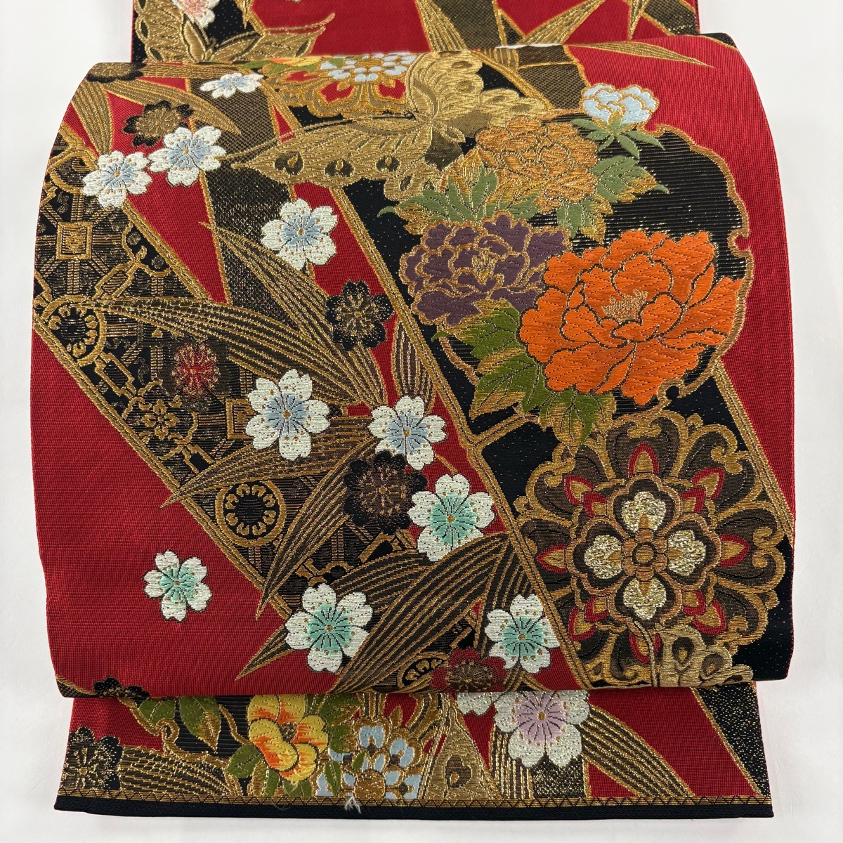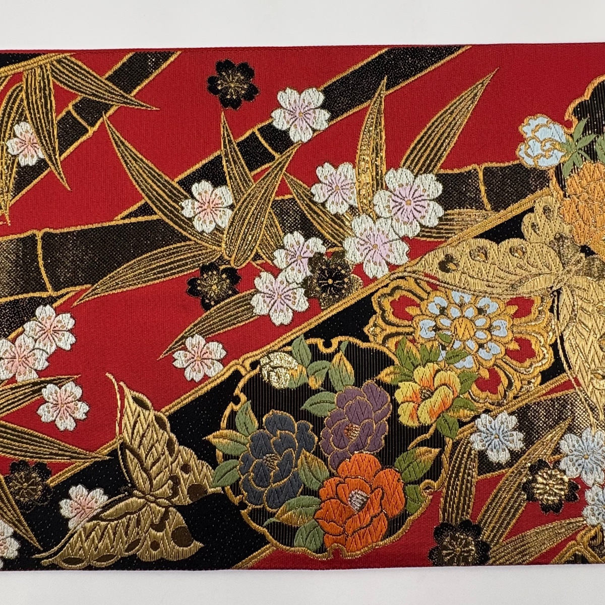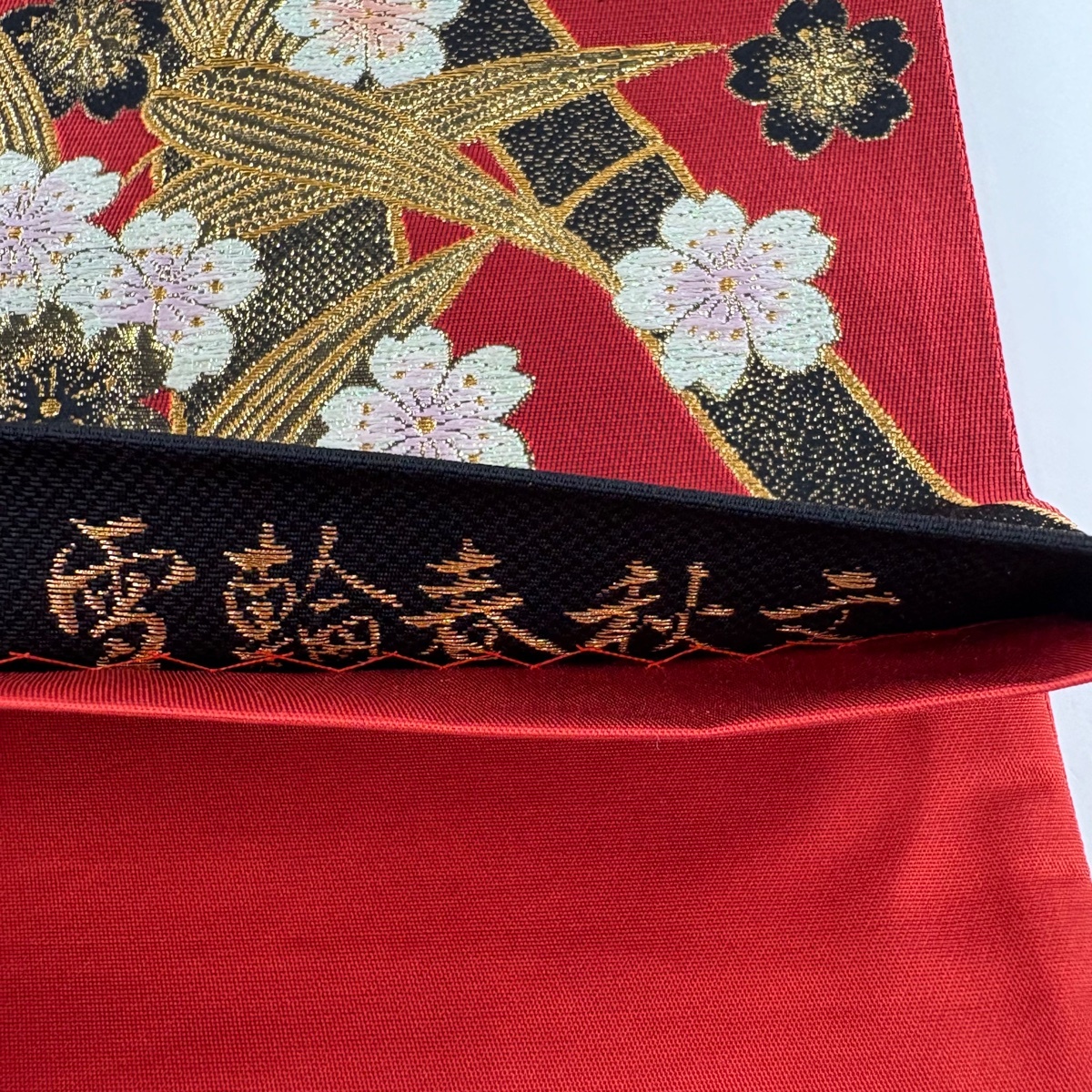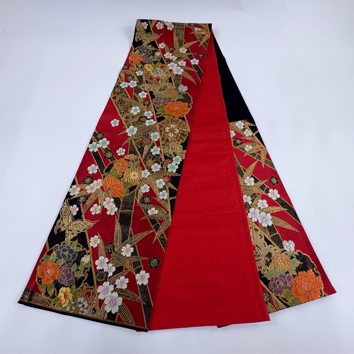 | 袋帯 美品 秀品 草花 蝶 金糸 刺繍 赤 六通 正絹 【中古】 |