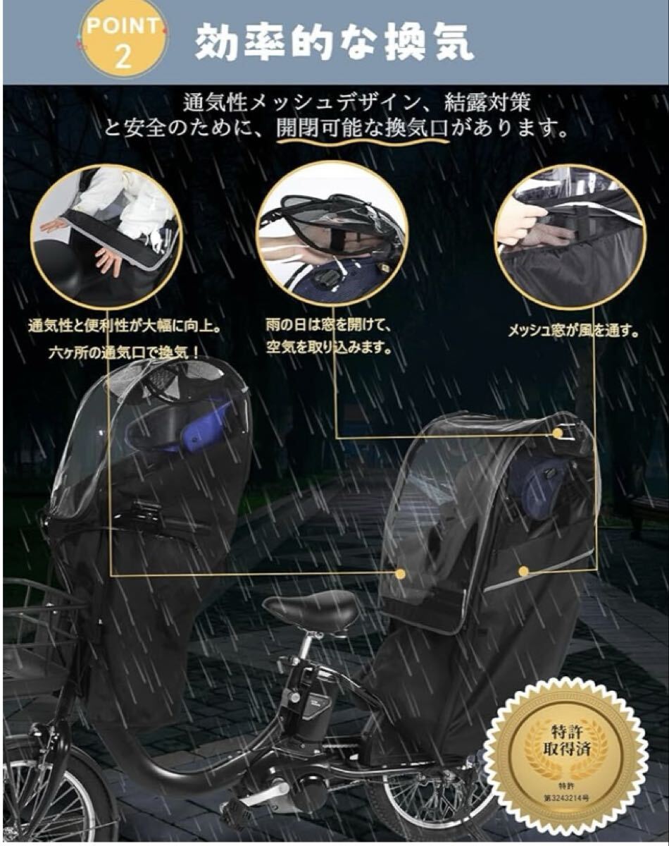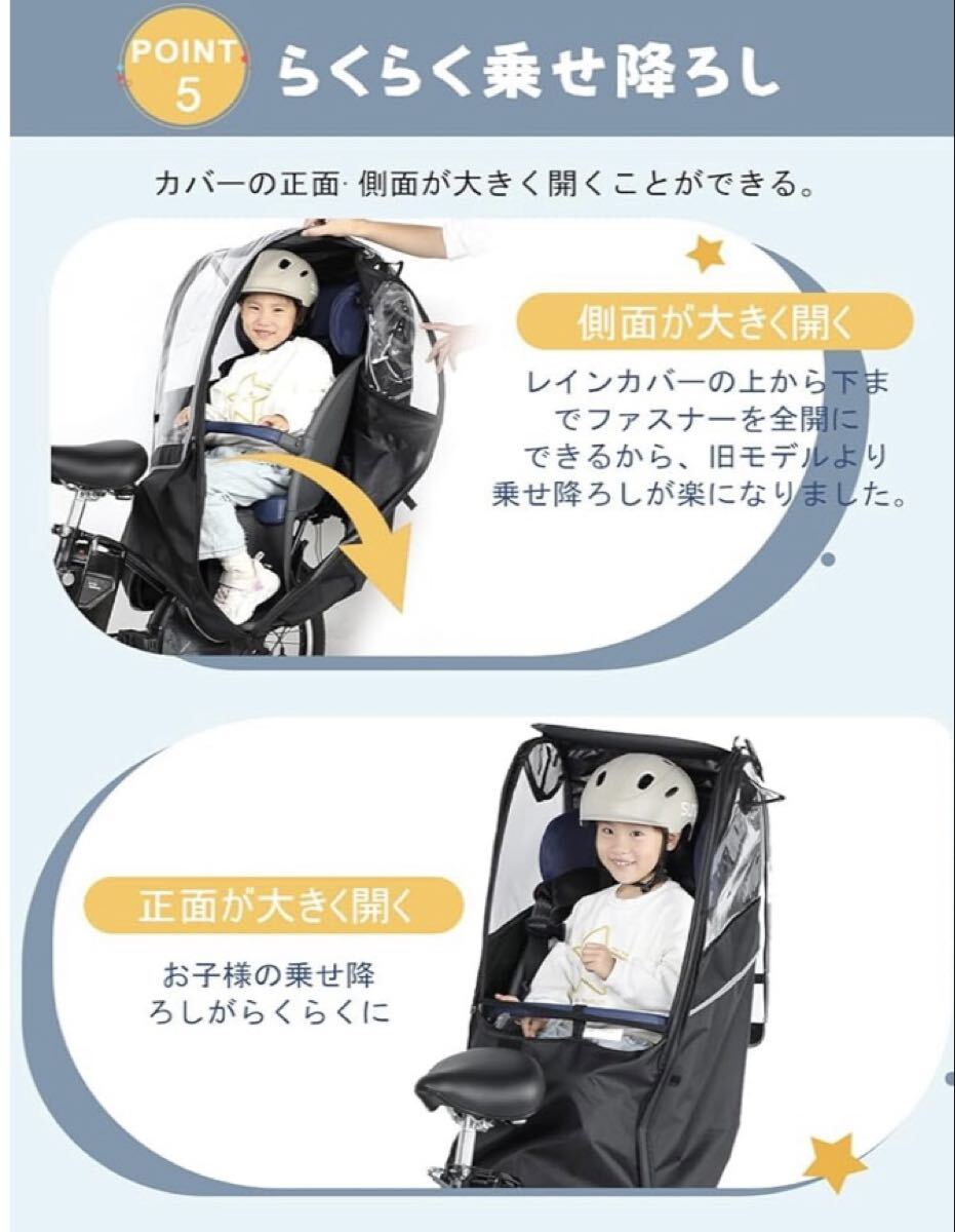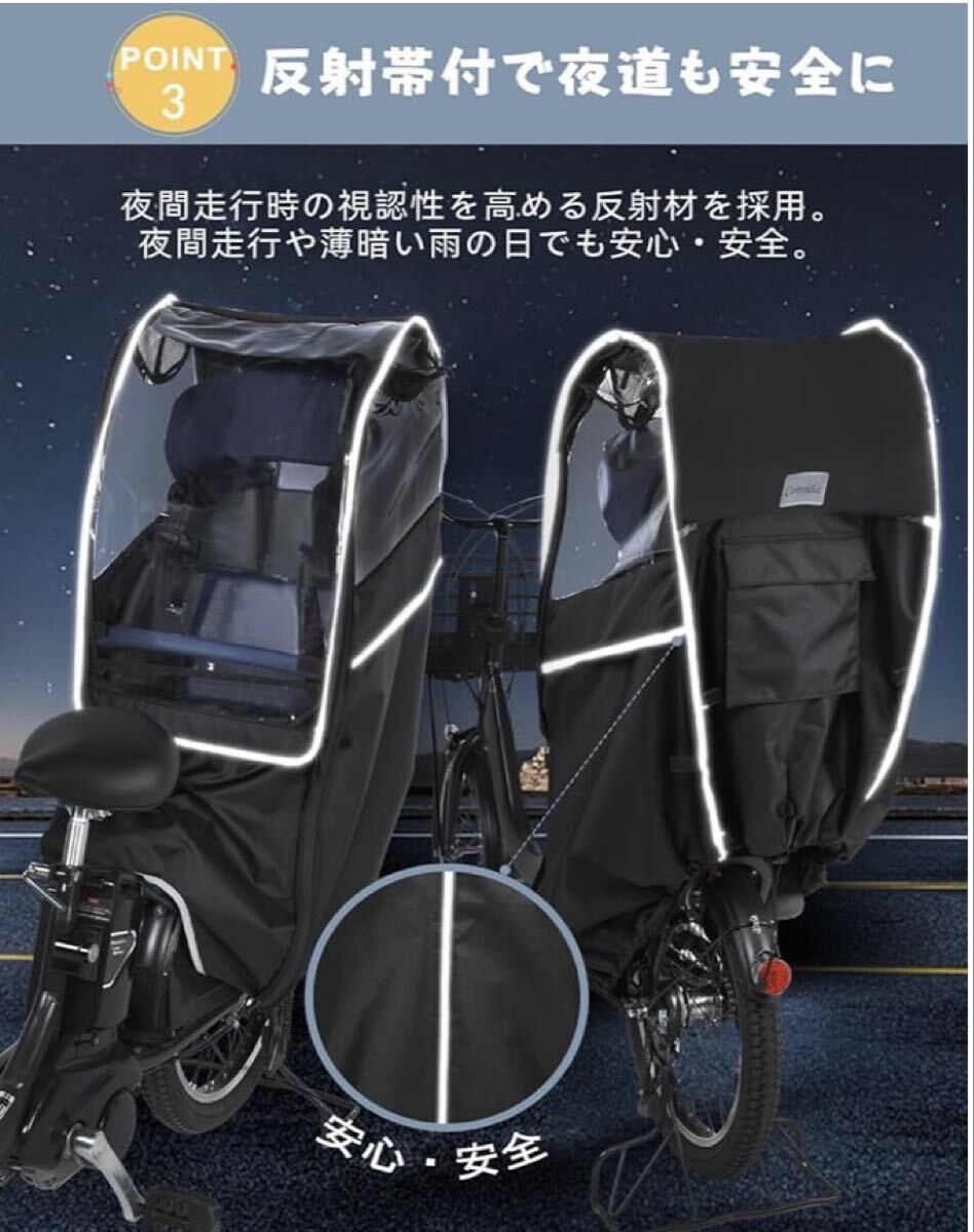 【らくらく乗せ降ろし&反射素材】:カバーの正面・側面が大きく開くことができるので、お子様の乗せ降ろしが楽々に。また、夜間走行時の視認性を高める反射材が採用されました。夜間走行や薄暗い雨の日でも安心・安全です。