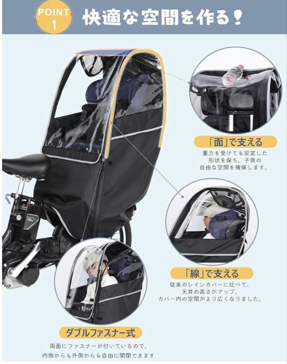 【簡単装着&大きなポケット】ヘッドレストを最も高い位置まで上げて、レインカバーを上から被せ、取付けベルトを巻いたらカバーを取り付け完了。背面部分には大きなポケットをつけました。自転車に乗る時に必要ある物を収納します。