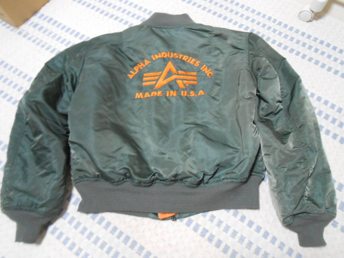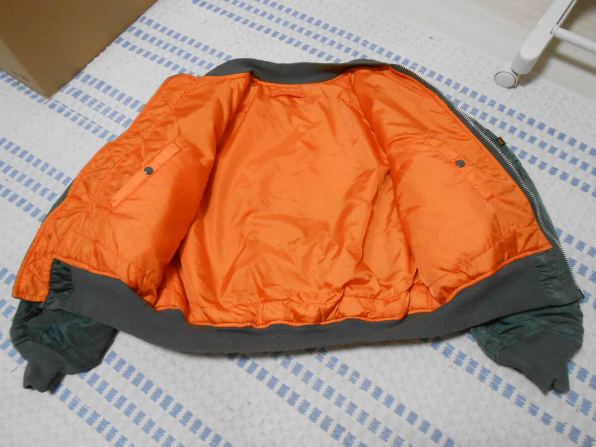 80~90’s USA製!アルファ MA-1 バックプリント L セージグリーンxレスキューオレンジ アメリカ製 ALPHA L-2B B-15 N-3B