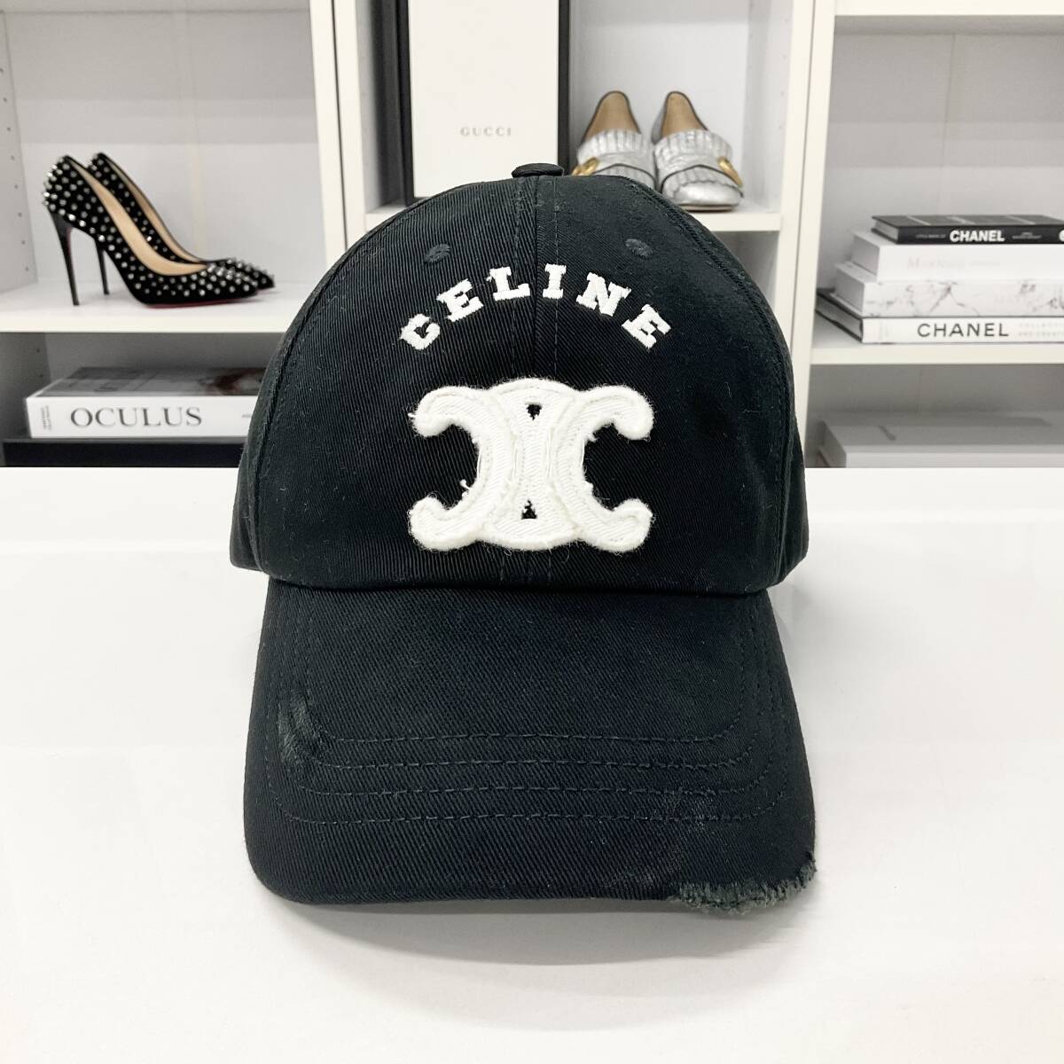 セリーヌ トリオンフ ロゴ コットン ベースボールキャップ ダメージ加工 帽子 ブラック