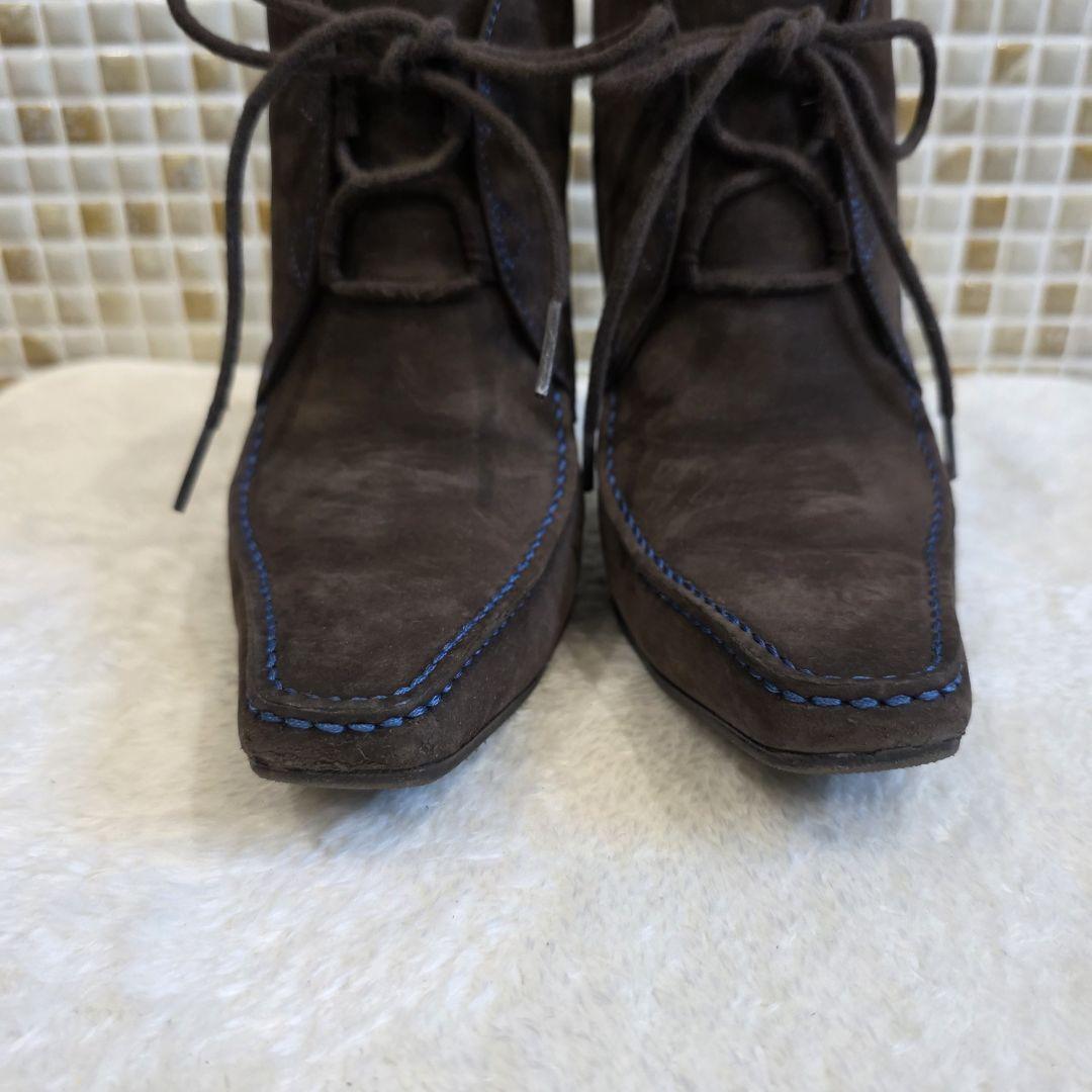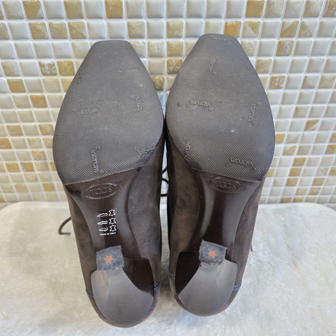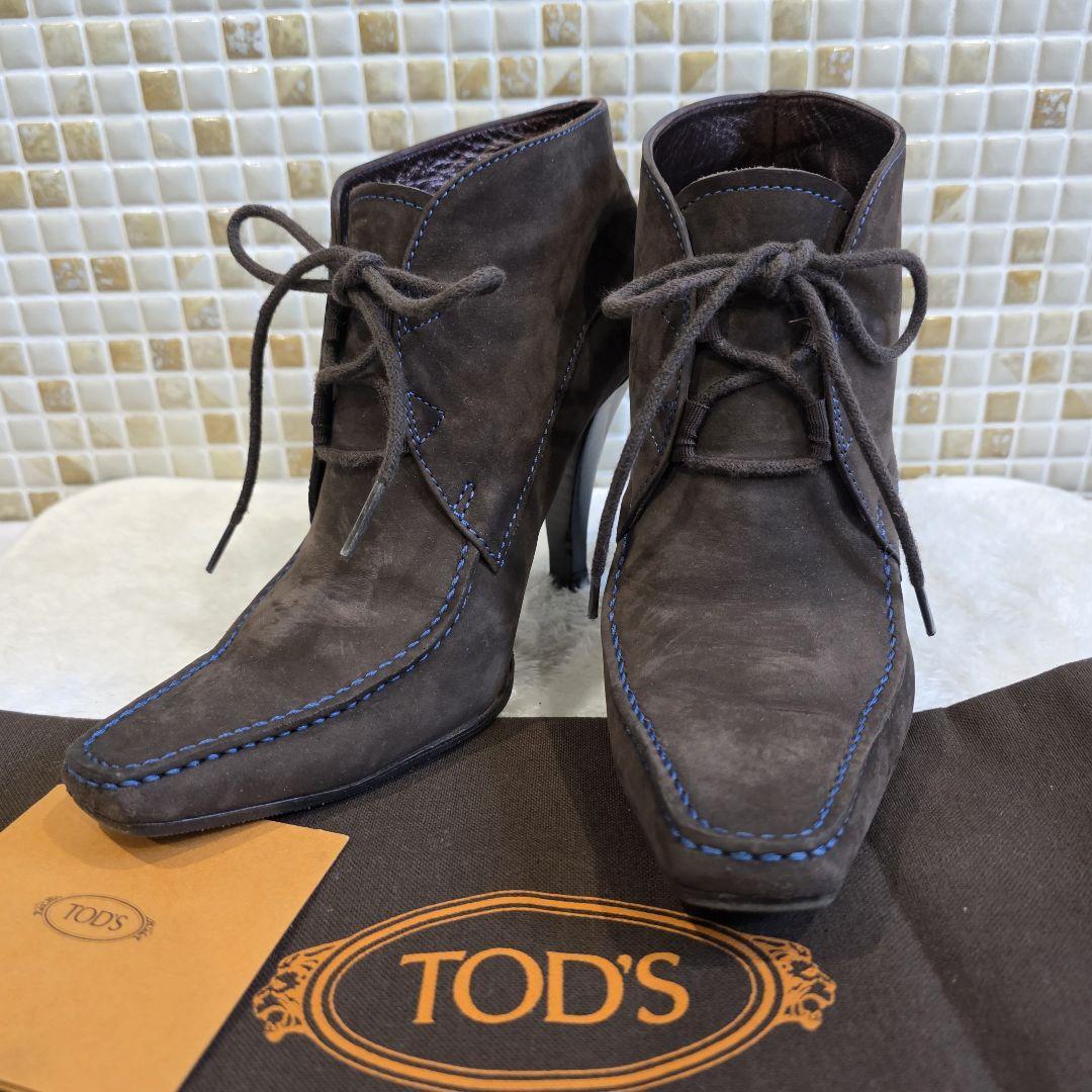 上質なブラウンスエードにブルーステッチが映える、TOD'Sのレースアップブーティ。スクエアトゥとすっきりとしたシルエットで、モード感と上品さを兼ね備えたデザインです。