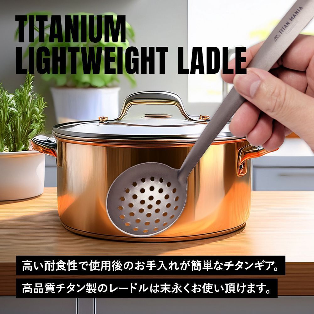 超軽量で頑丈!ソロキャンプ時の使用にちょうど良いサイズ感で、具材だけを取り出すのに適した錆に強い軽量タイプのチタンレードル(穴あきおたま)。揚げ物や茹でた食材の取り出しに便利な穴あきタイプ。チタン製で焚き火やバーナーなど直火に対応可能。お玉の先端はクッカーや鍋の側面にフィットしやすい楕円型なのですくいやすい。