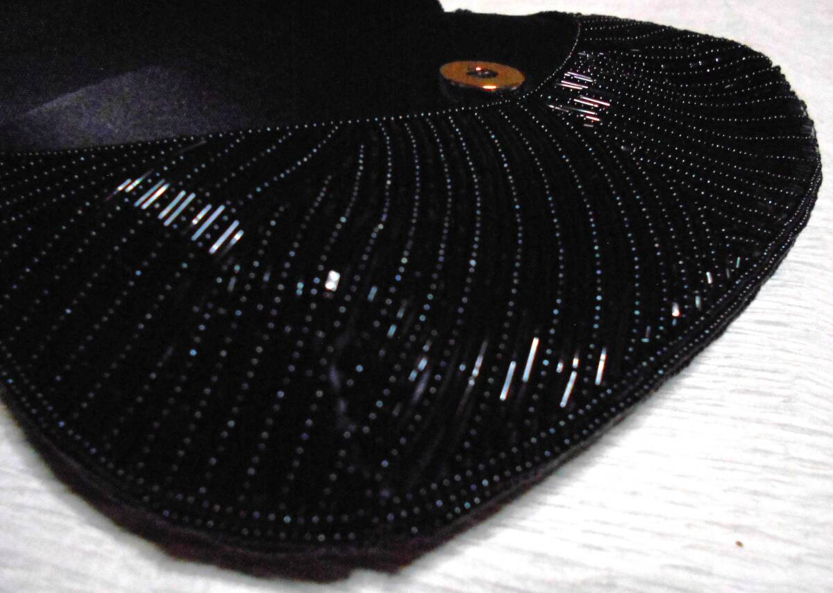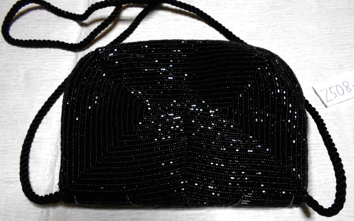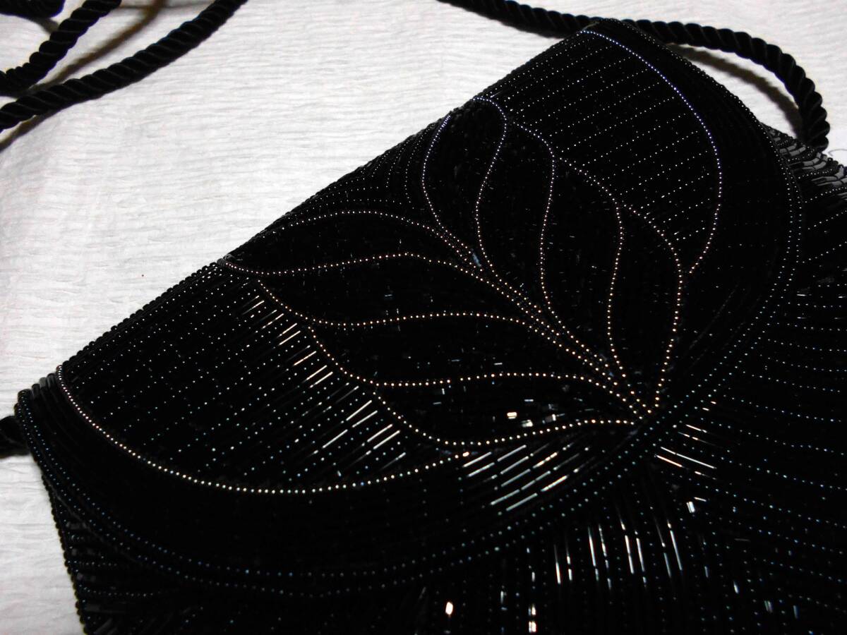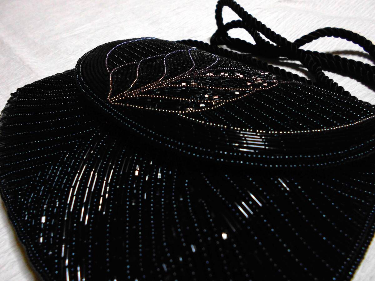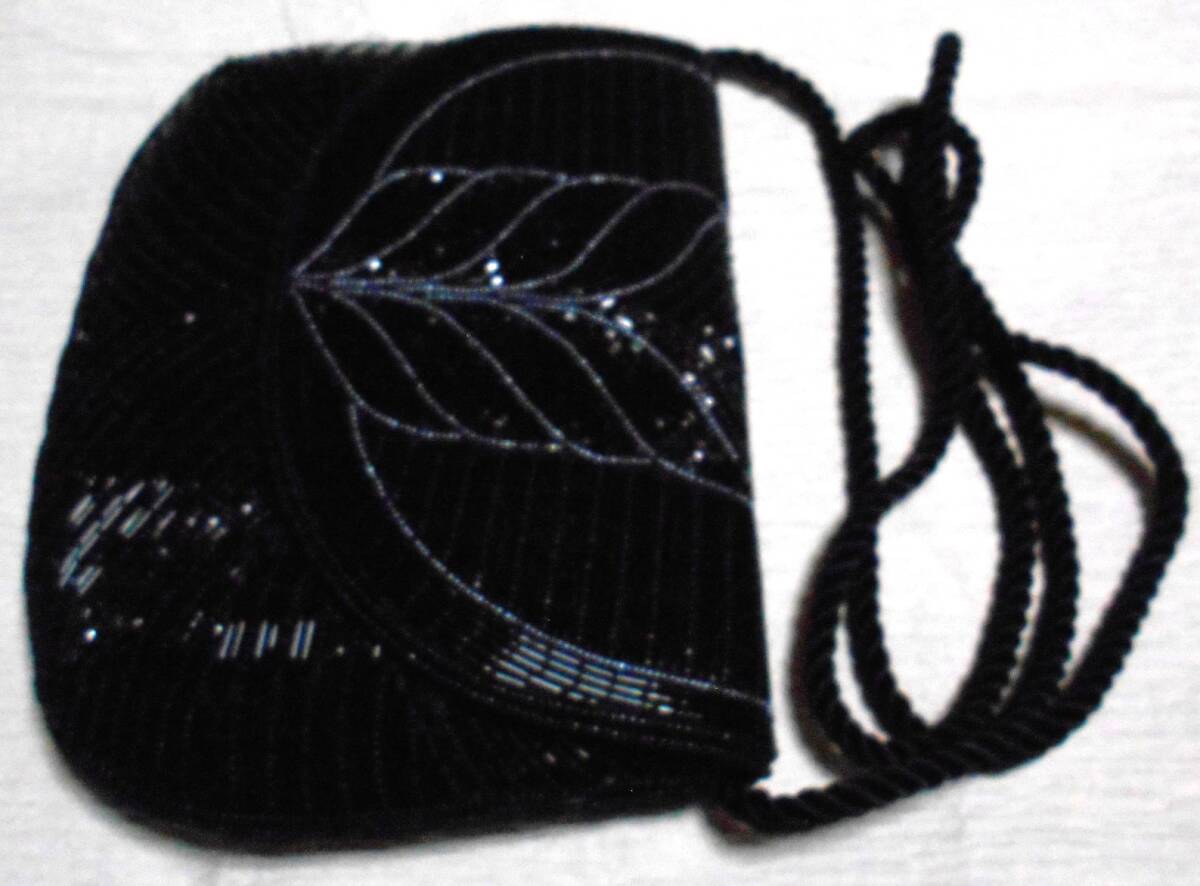 黒色のビーズに玉虫ビーズで葉柄のポシェットです。