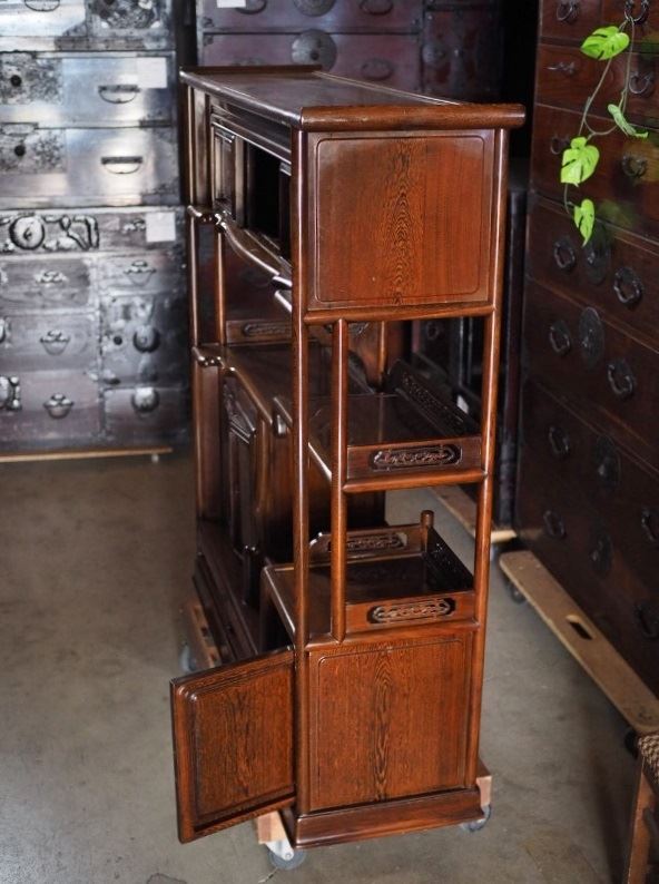 【商品説明】銘木・鉄刀木(たがやさん)の飾り棚 昭和後期。とても重量のある存在感抜群な飾り棚です。 劣化については画像・動画をご確認ください。不明点は電話・LINE・メール・Instagramメッセージにてお問い合わせください。誠実にお答えいたします。A display shelf made from the precious ironwood (Tagayasan) from the late Showa period. It is a very heavy display shelf with a striking presence.Please check the images and video for signs of deterioration. If you have any questions, please contact us by phone, LINE, email, or Instagram message. We will answer honestly.