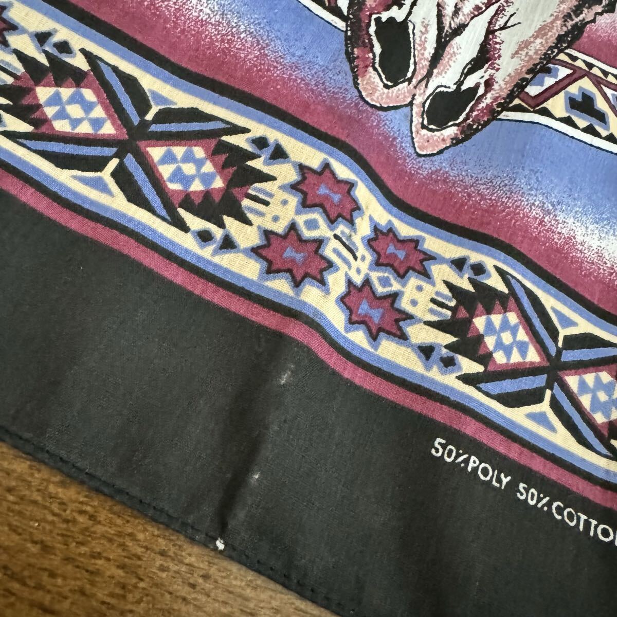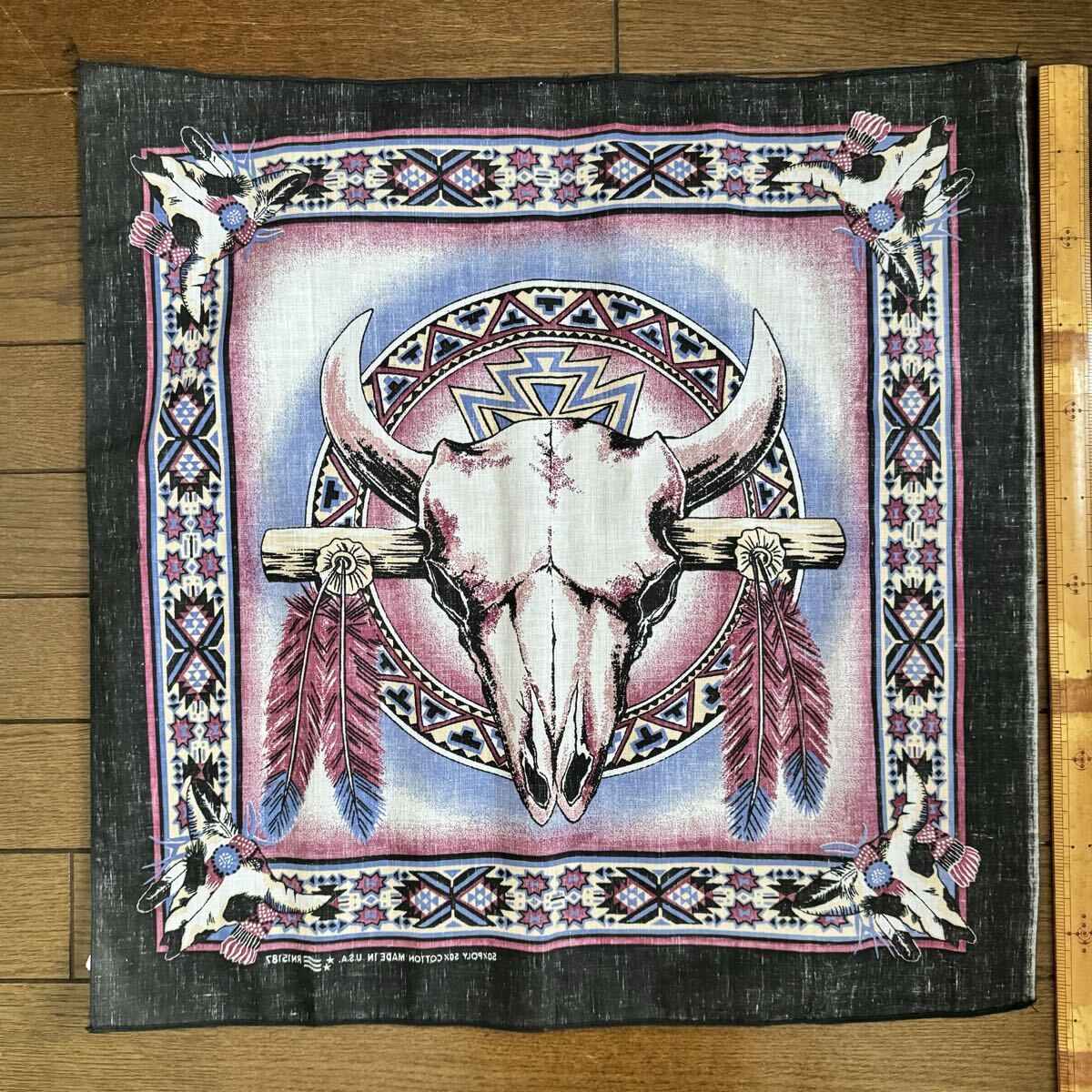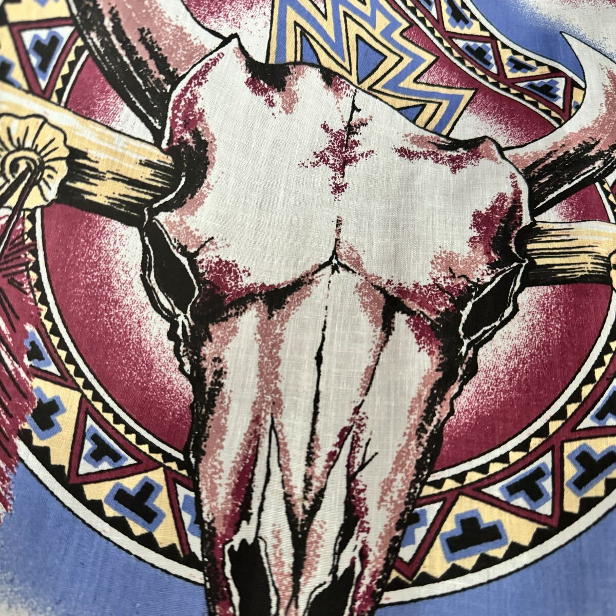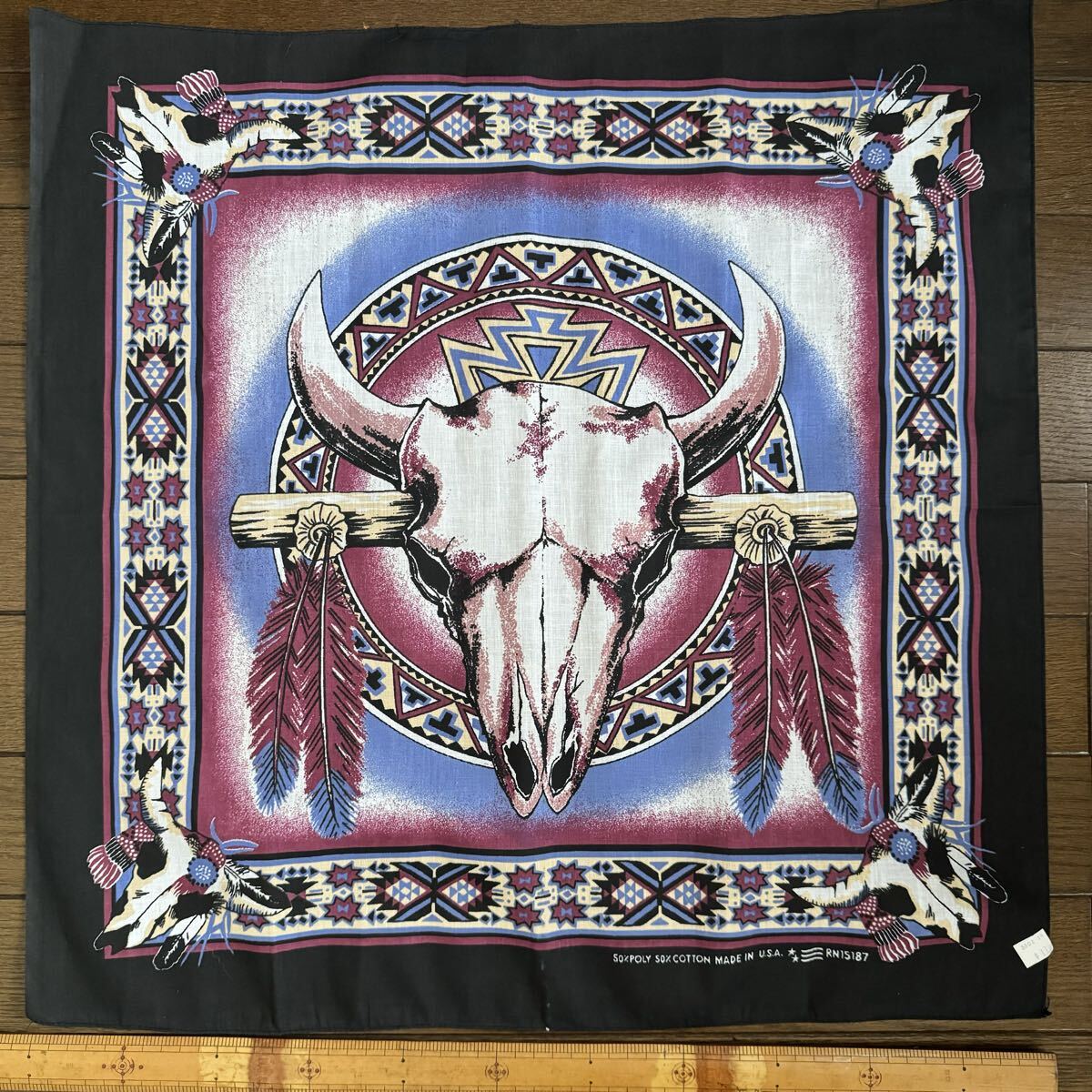 メイドインUSAの80s〜90s辺りの魔除けとしても人気のあるバッファロースカルインディアン ネイティブアメリカモチーフのビンテージバンダナです。