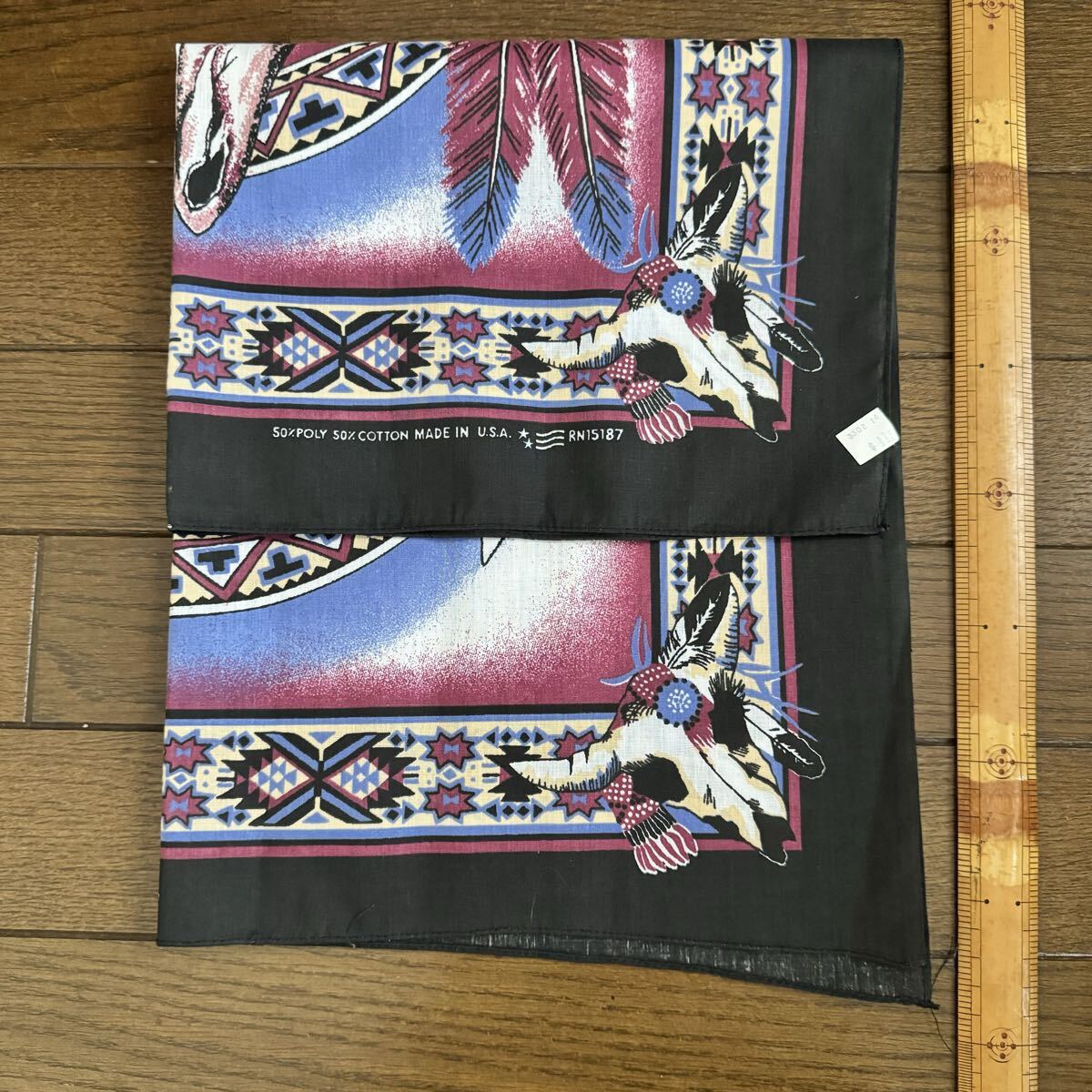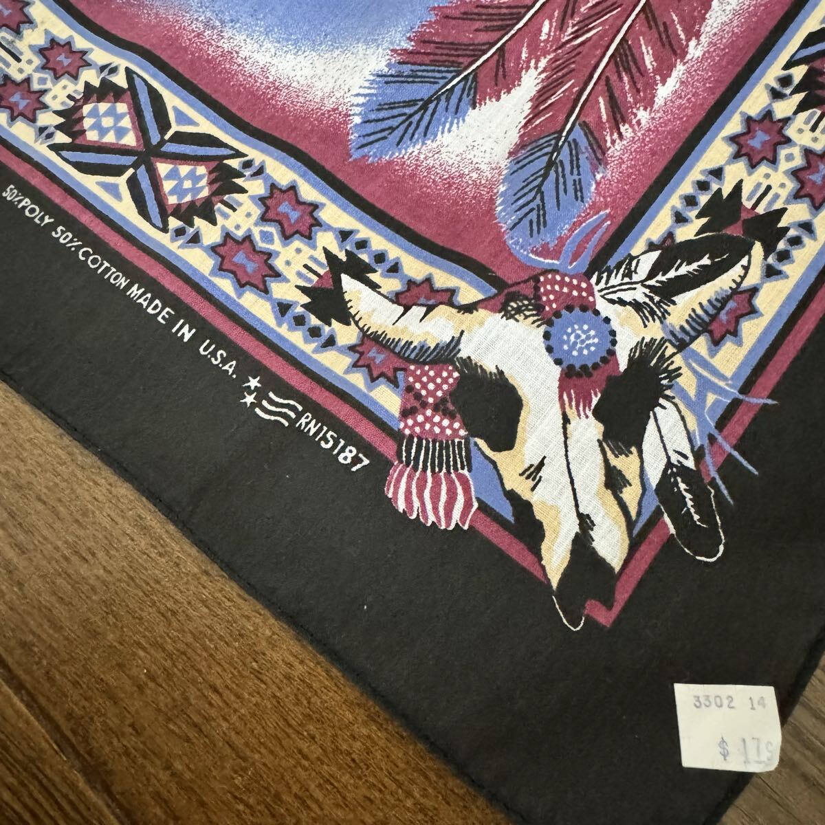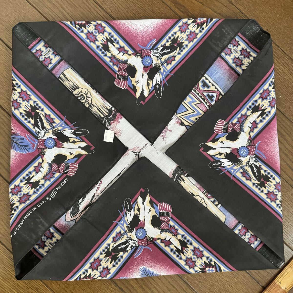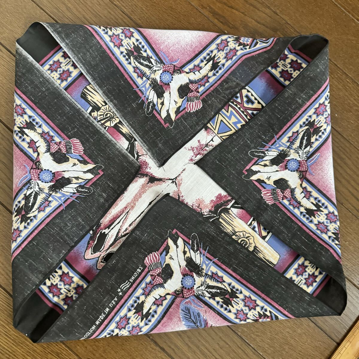 メイドインUSAの80s〜90s辺りの魔除けとしても人気のあるバッファロースカルインディアン ネイティブアメリカモチーフのビンテージバンダナです。