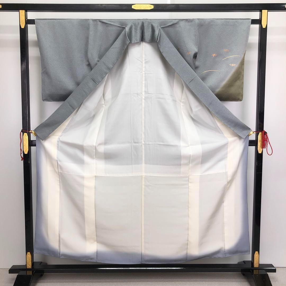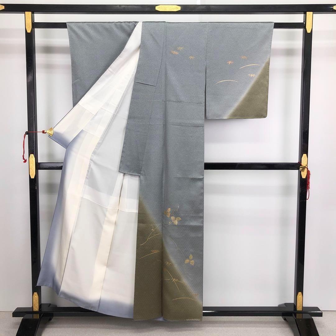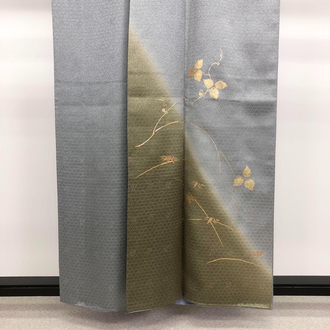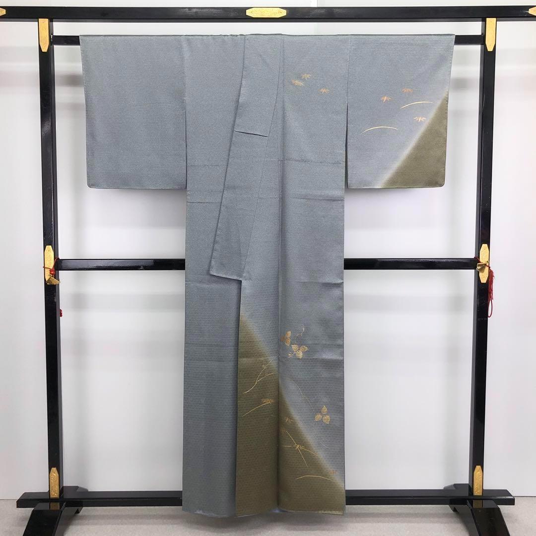 付下げ 上品な金彩蔦葉模様 籠目模様 但馬縮緬 灰色 K-3243 着物 きもの kimono 和服 和装 中古 リサイクル着物 【送料無料】