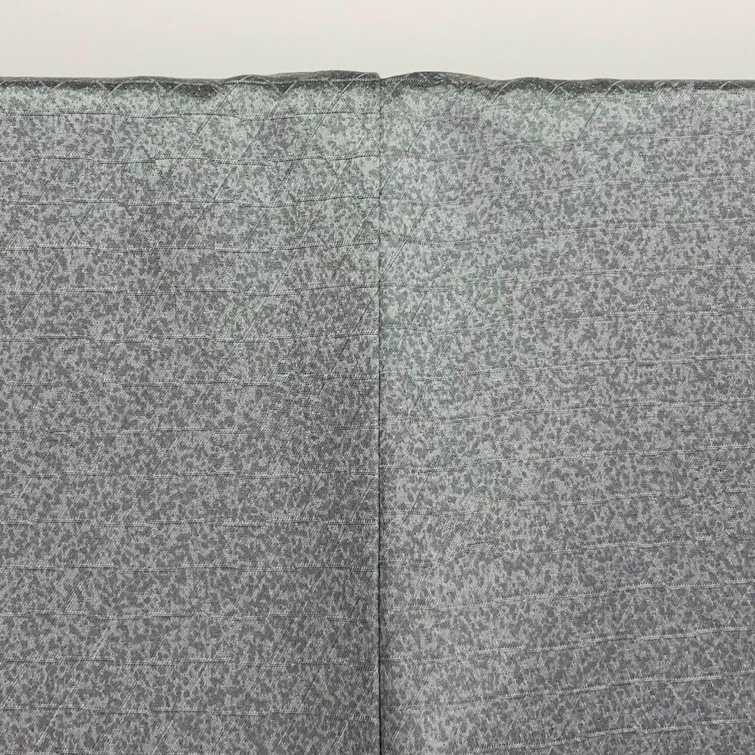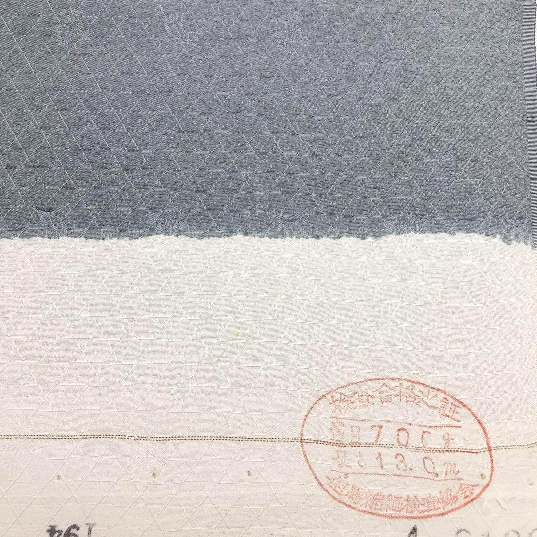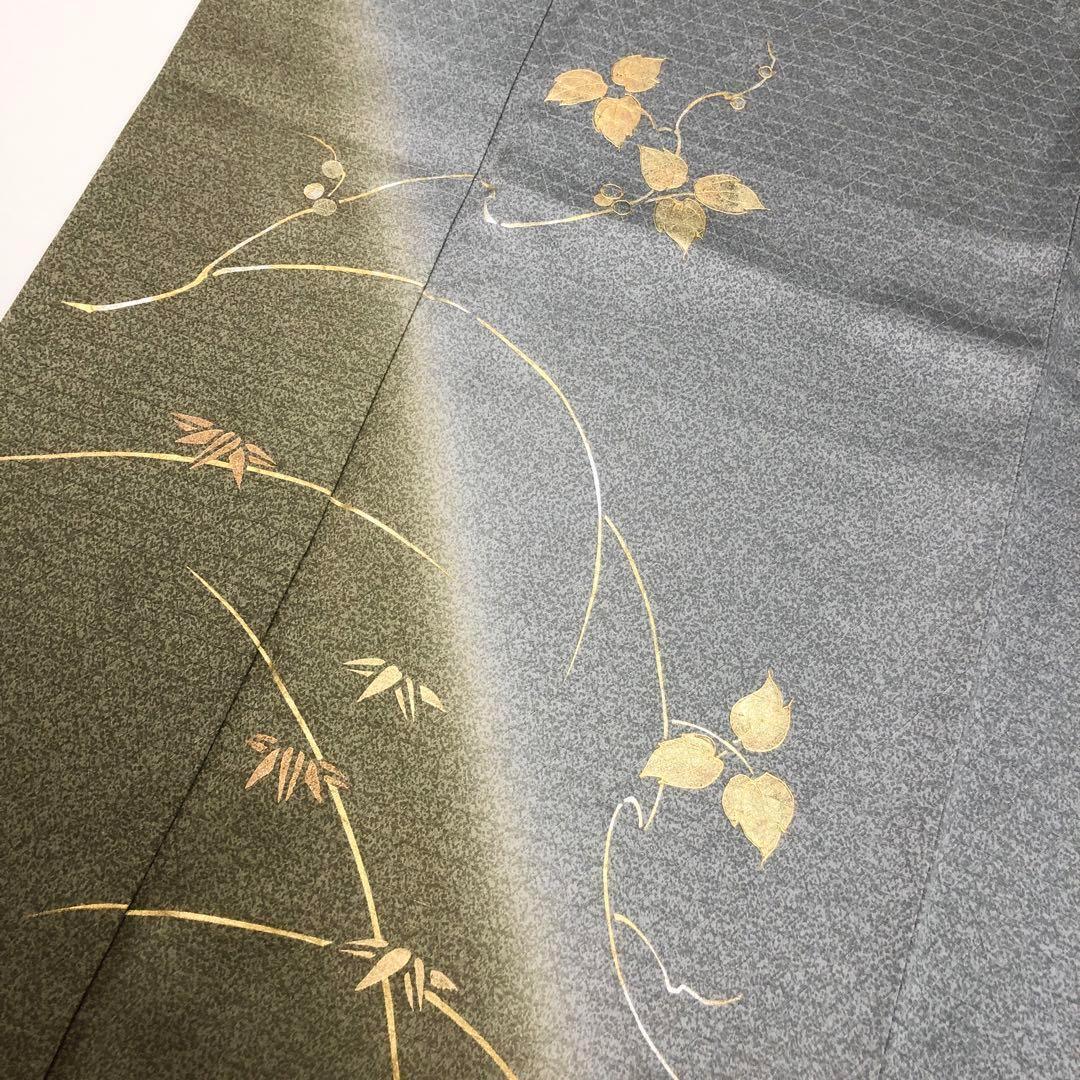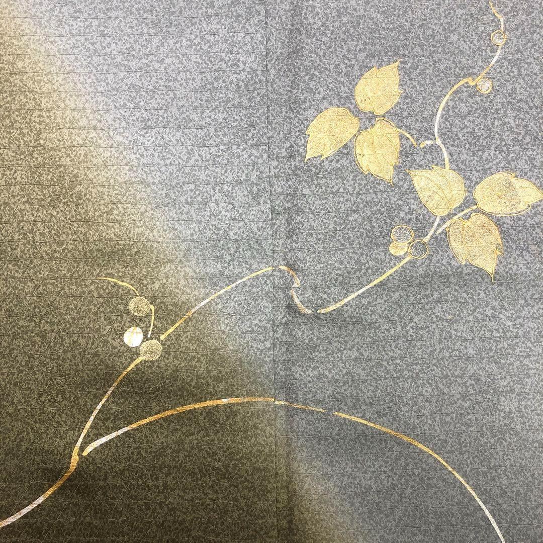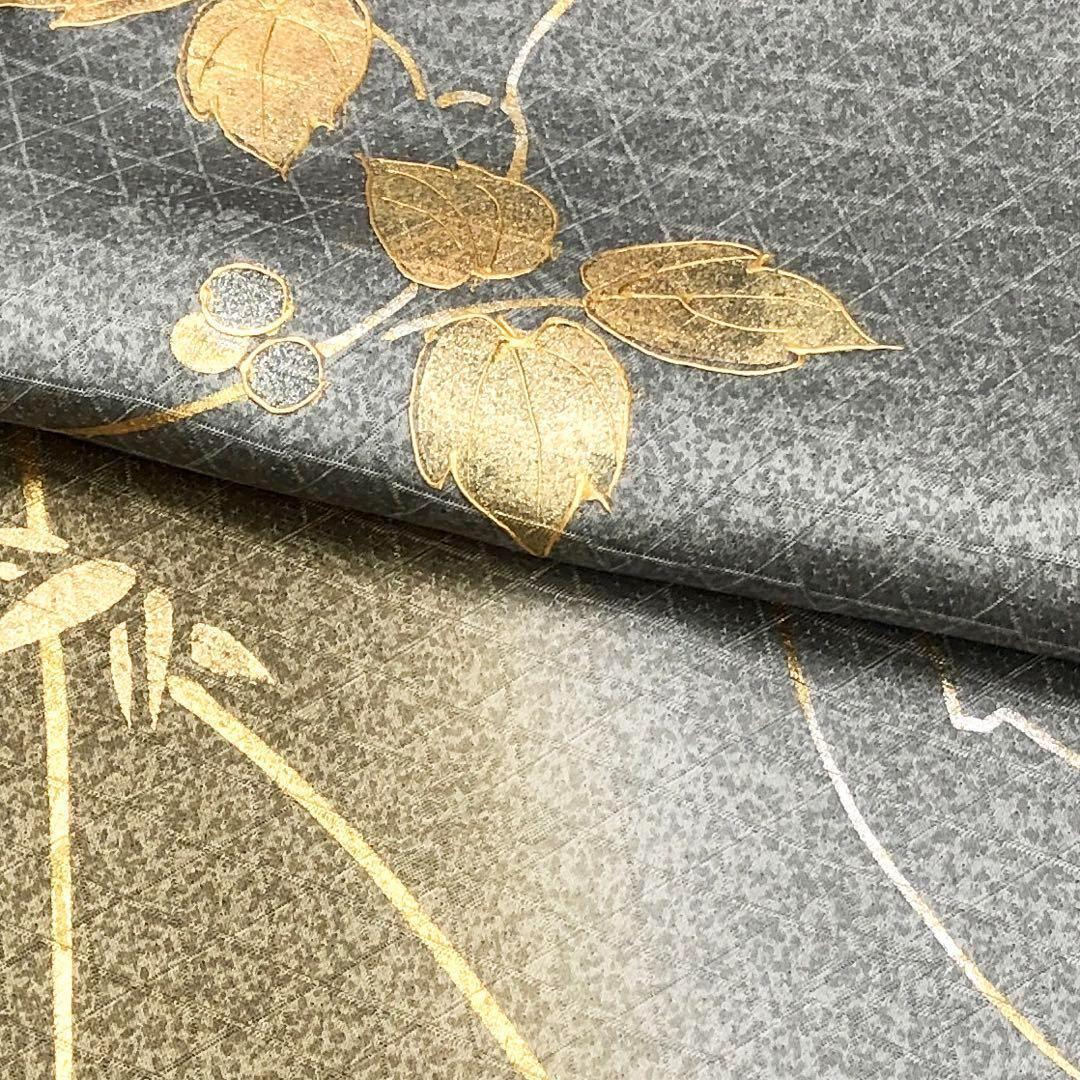 手触りの良い灰色の但馬縮緬に籠目模様に金彩を使った蔦葉模様がデザインされた素敵なお品でございます。