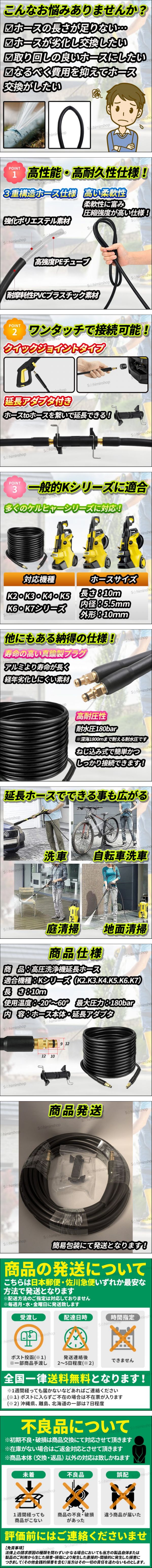ご覧頂きありがとうございます! 高圧洗浄機ケルヒァーKシリーズ対応の延長ホース【10m】の紹介です! 高圧洗浄機を利用していてこんなシーンはないでしょうか? ・ホースの長さが足りなく掃除が不便… ・ホースが劣化して交換を検討している ・取り回しの良いホースにして使い勝手をよくしたい などなど 付属のアダプタを介して差し込むだけで延長できるので届いたらすぐ利用でき 洗車・排水管洗浄・庭の清掃などホースが延長した分、できることも広がります! ポイントは3点! 1,高圧洗浄するのに十分な高性能・高耐久性仕様! 2,お持ちのケルヒァーシリーズに対応できるように専用アダプタ付属! 3,様々なケルヒァーKシリーズに対応しているので安心! 他にも寿命の高い真鍮プラグを採用していたり 高圧洗浄機に必要な高耐圧性があります! | |||